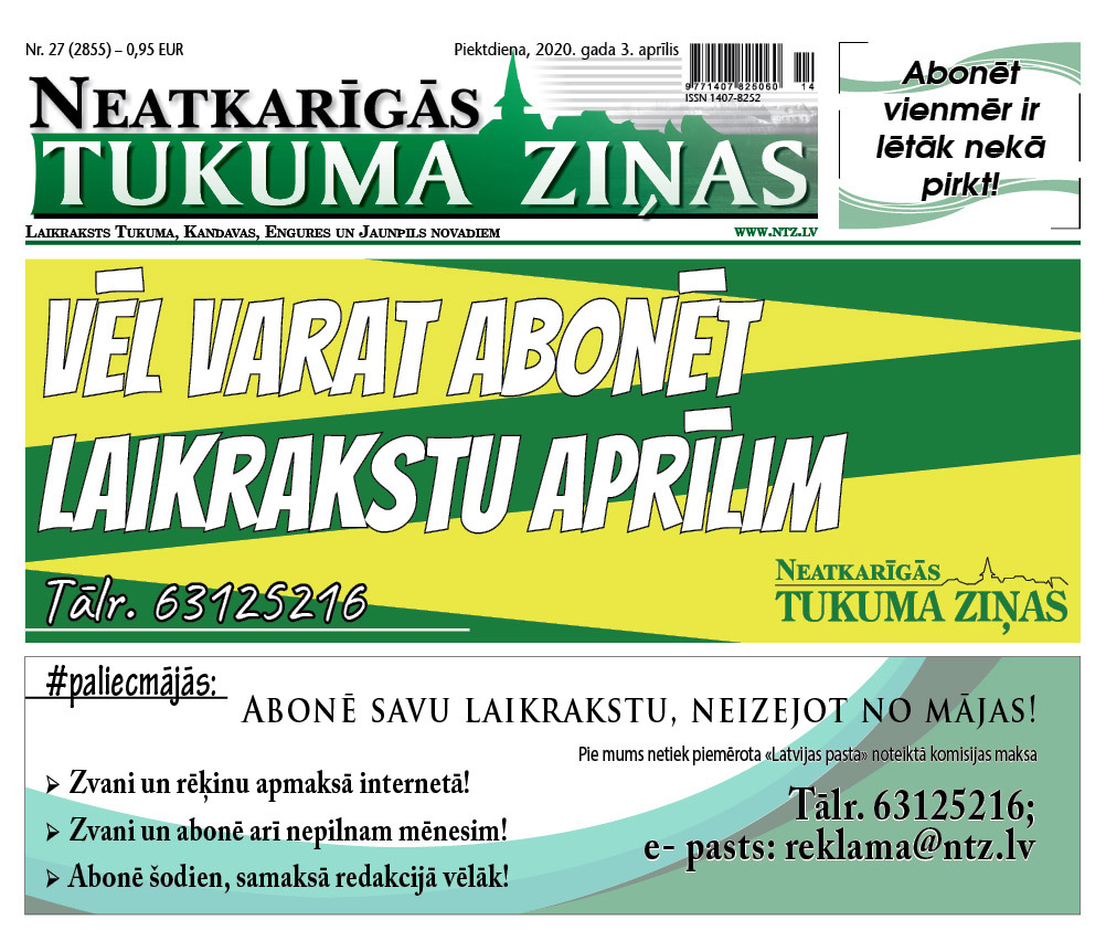 Kaut aprīlis jau burā, vēl arvien vari paspēt abonēt laikrakstu «Neatkarīgās Tukuma Ziņas».