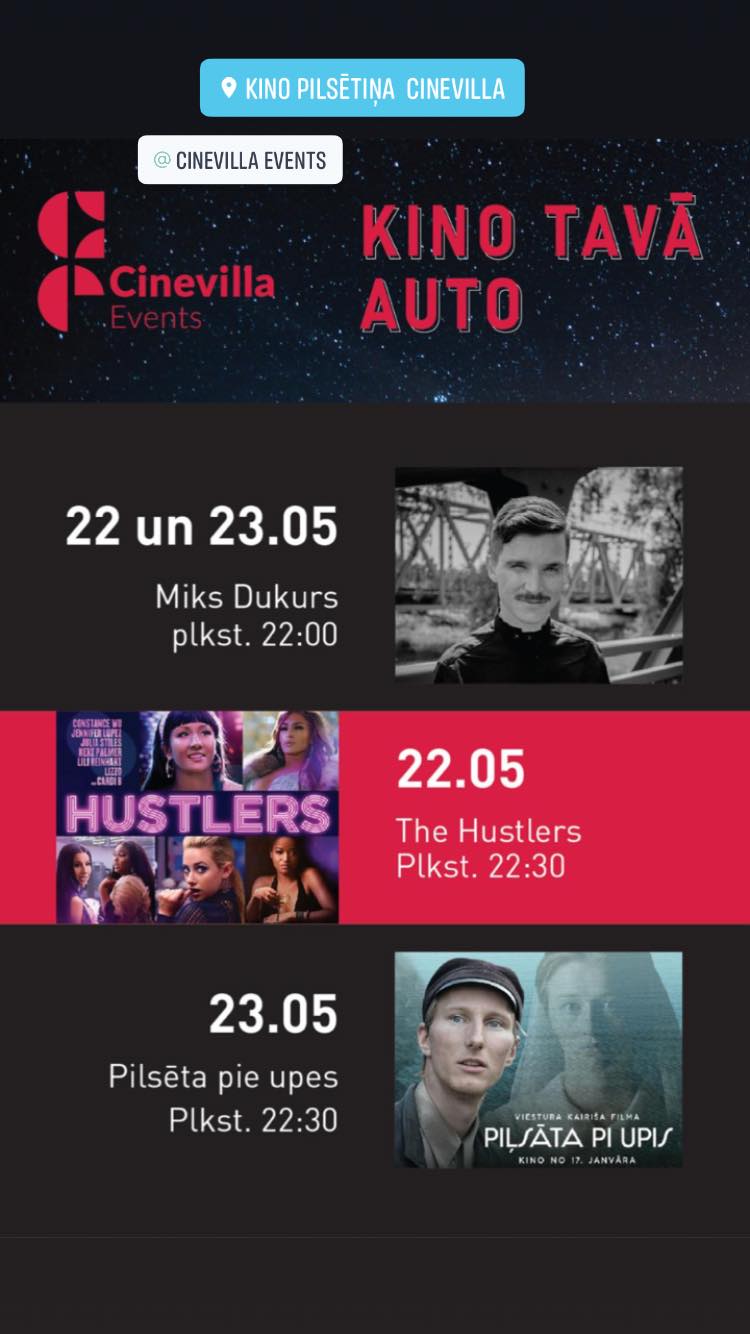 Šo piektdien un sestdien, 22. un 23. maijā pirms “Kino tavā auto” atklāšanas seansiem visus priecēs un pozitīvi uzlādēs Miks Dukurs. Savukārt kino seansā piektdien, 22.maijā būs iespēja vērot komēdiju “Hustlers / Afēristes” ar aktrisi Dženiferi Lopesu galvenajā lomā, bet sestdien, 23.maijā – latviešu filmu “Pilsēta pie Upes”.