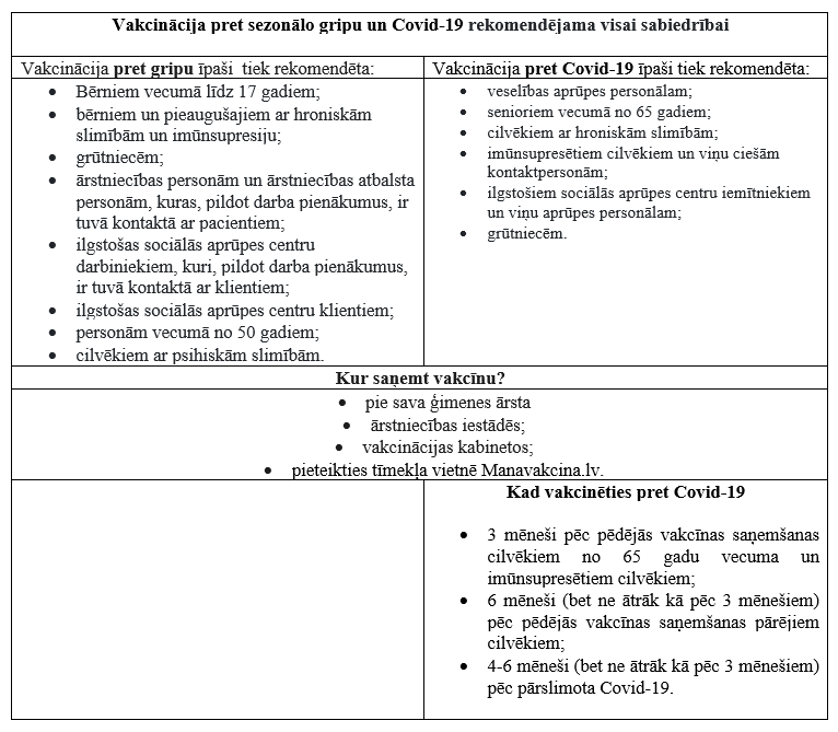 ! Speciālisti aicina seniorus un cilvēkus ar hroniskām slimībām neatlikt vakcināciju pret sezonālo gripu un Covid-19 . Vakcinācijai var pieteikties pie sava ģimenes ārsta, ārstniecības iestādēs, vakcinācijas kabinetos vai portālā manavakcina.lv.
