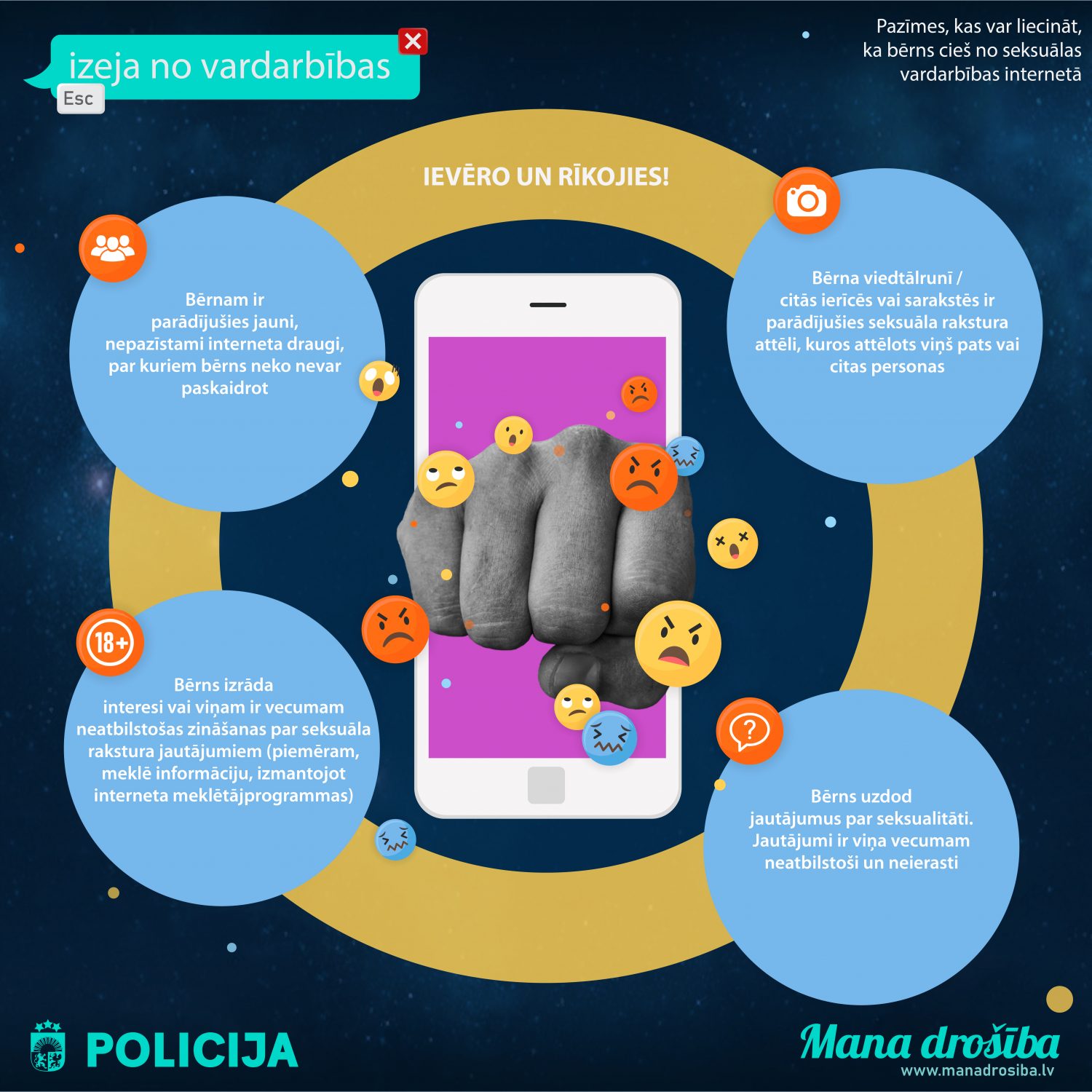 Ar katru gadu Valsts policijā pieaug reģistrēto iesniegumu skaits par noziedzīgo nodarījumu pret personu tikumību un dzimumneaizskaramību tiešsaistē. Arvien biežāk tiek izmeklēti noziegumi, kur pieaugusi persona interneta vidē ir seksuāli izmantojusi mazgadīgu vai nepilngadīgu bērnu. Lai veicinātu plašāku problēmas apzināšanos un atpazīstamību, mazinātu dzimumnoziegumus internetā un sekmētu iespējamo cietušo personu atpazīšanu, Valsts policija ir uzsākusi informatīvu akciju bērnu vecākiem «Izeja no vardarbības – escape» par nodarījumiem pret tikumību un dzimumneaizskaramību internetā.