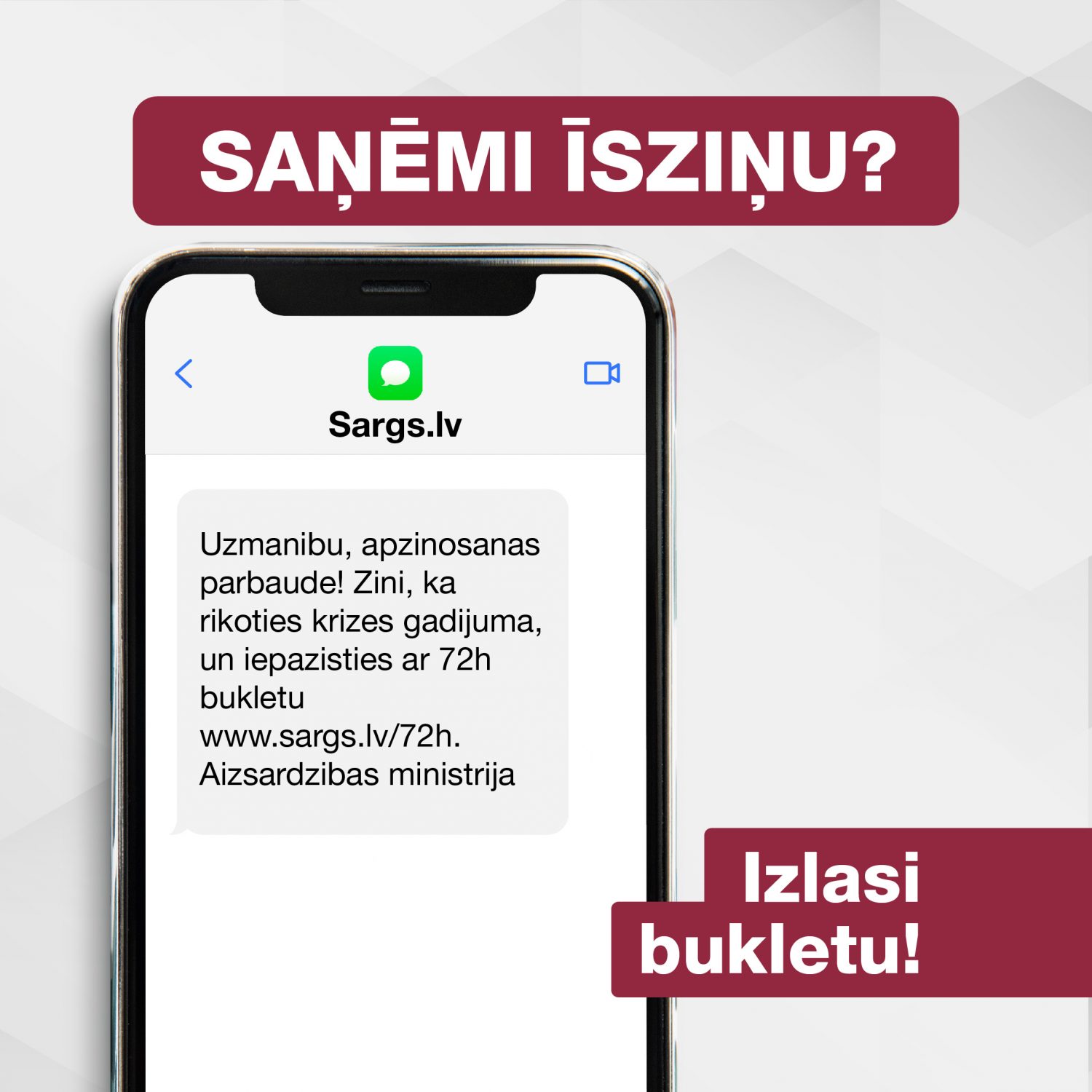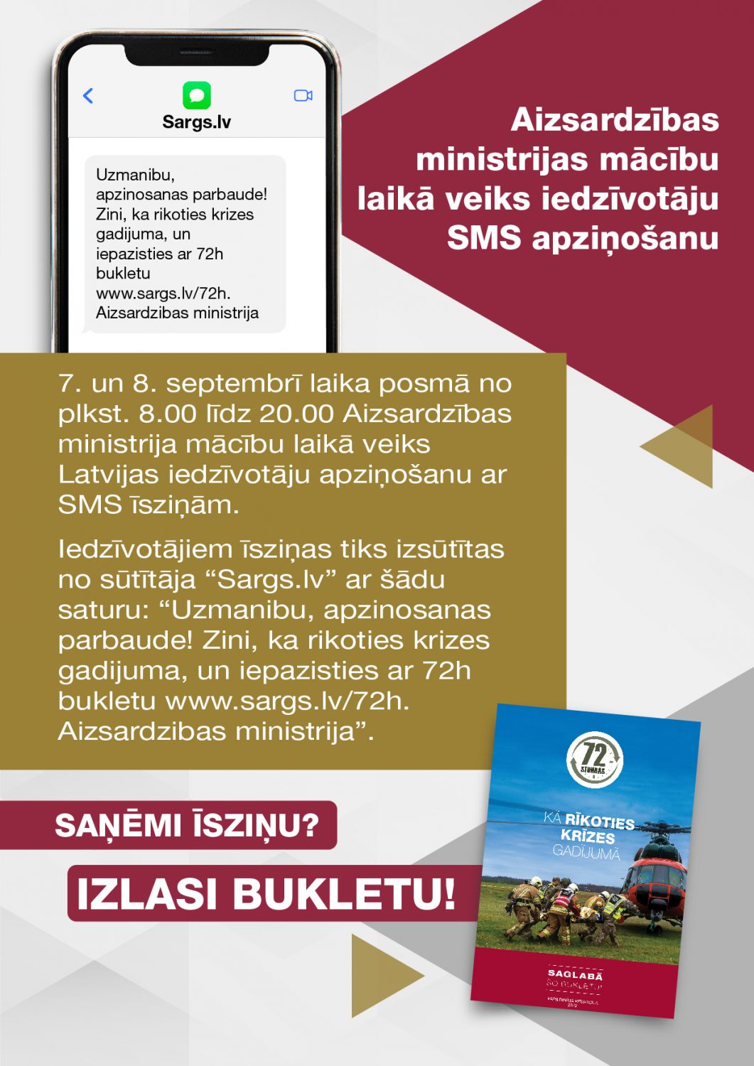 Iedzīvotājiem īsziņas tiks izsūtītas no sūtītāja “Sargs.lv” ar šādu saturu: “Uzmanibu, apzinosanas parbaude! Zini, ka rikoties krizes gadijuma, un iepazisties ar 72h bukletu www.sargs.lv/72h. Aizsardzibas ministrija”. Saņemot īsziņu, iedzīvotāju vēlamā rīcība ir iepazīties ar 72h bukleta saturu, lai zinātu, kā rīkoties dažādās krīzes situācijās.