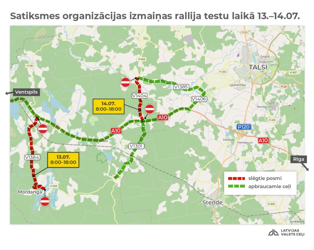 Sestdien, 13. jūlijā, un svētdien, 14. jūlijā, Talsu apkārtnē būs satiksmes organizācijas izmaiņas un būs slēgti atsevišķi valsts vietējo autoceļu posmi, jo notiks Tet Tet Rally Latvia – FIA pasaules rallija čempionāta testa braucieni. Aicinām autovadītājus izmantot apbraucamos ceļus (skat. shēmu jeb attēlu).