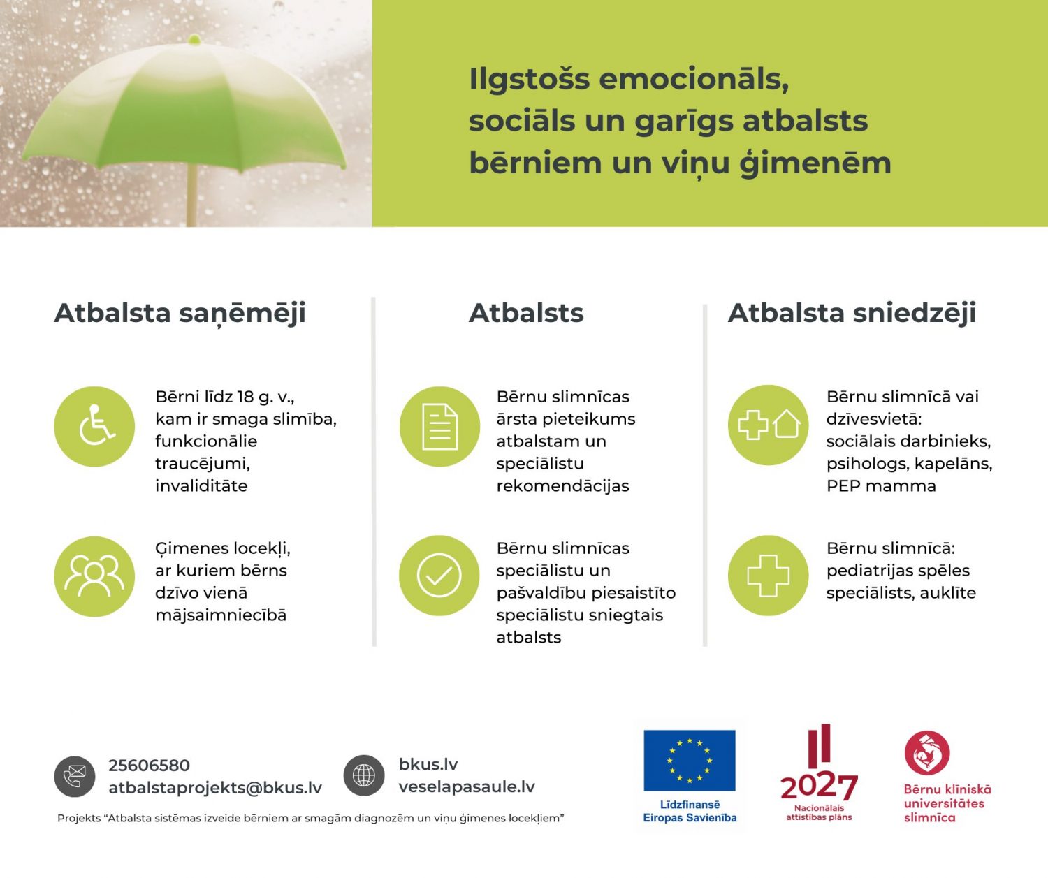 Atbalsta veidi, ko bērni ar smagām diagnozēm var saņemt, ir: Bērnu slimnīcas speciālistu konsultācijas klātienē vai attālināti; atbalsta grupas bērniem un/vai ģimenes locekļiem; Bērnu slimnīcas speciālistu rekomendācijas par atbalstu ģimenei dzīvesvietā; Bērnu slimnīcas sociālā darbinieka atbalsts visā rekomendēto pakalpojumu sniegšanas laikā; atbalsta pakalpojumi dzīvesvietā sadarbībā ar pašvaldības sociālo dienestu.