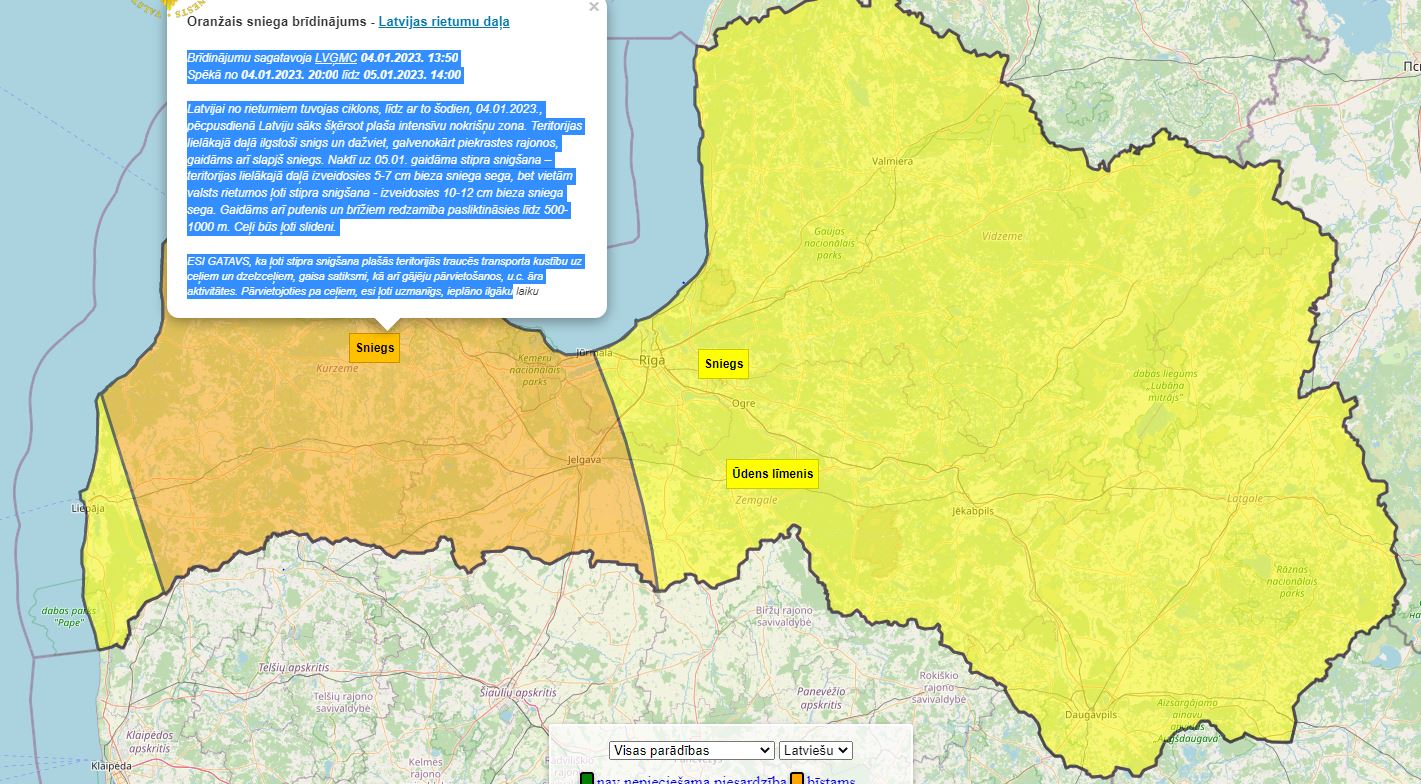 Teritorijas lielākajā daļā ilgstoši snigs un dažviet, galvenokārt piekrastes rajonos, gaidāms arī slapjš sniegs. Naktī uz 05.01. gaidāma stipra snigšana – teritorijas lielākajā daļā izveidosies 5-7 cm bieza sniega sega, bet vietām valsts rietumos ļoti stipra snigšana – izveidosies 10-12 cm bieza sniega sega. Gaidāms arī putenis un brīžiem redzamība pasliktināsies līdz 500-1000 m. Ceļi būs ļoti slideni.