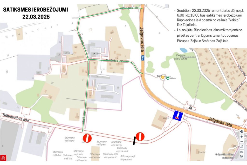 Šo sestdien, 22. martā, remontdarbu dēļ no. 8.00 līdz 18.00 būs satiksmes ierobežojumi Rūpniecības ielā no veikala “Vakko” līdz Zaļai ielai. Lai nokļūtu Rūpniecības ielas mikrorajonā, no pilsētas centra, lūgums izmantot posmus Pārupes – Zaļā vai Smārdes – Zaļā iela.