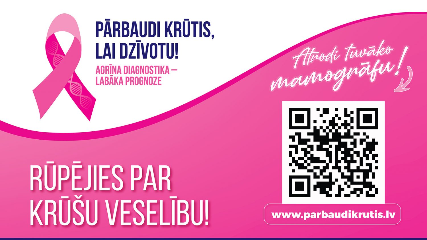 Kampaņu “Pārbaudi krūtis, lai dzīvotu!” rīko Latvijas Onkologu asociācija un krūts vēža pacientu atbalsta biedrība “Vita”. Kampaņas mērķis ir aicināt sievietes rūpēties par savu veselību, izmantojot valsts apmaksātās krūts mamogrāfijas pārbaudes, un izglītot par agrīnas diagnostikas nozīmi krūts vēža ārstēšanā un personalizētas terapijas nozīmīgumu. Ikviena sieviete vecumā no 50 gadiem tiek aicināta sameklēt sev tuvāko mamogrāfu www.parbaudikrutis.lv un veikt valsts apmaksātu mamogrāfiju.