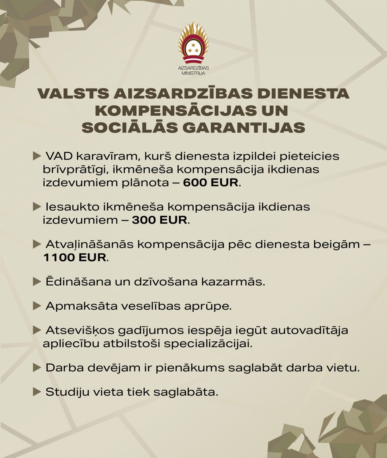 Plānots, ka valsts aizsardzības dienesta karavīram, kurš dienesta izpildei pieteicies brīvprātīgi, ikmēneša kompensācija būs 600 eiro apmērā, savukārt dienestā iesauktie karavīri saņems 300 eiro mēnesī. Tāpat plānota arī atvaļināšanās kompensācija pēc dienesta beigām 1100 eiro apmērā. Līdz ar to plānots, ka kompensācija par brīvprātīgu iesaisti valsts aizsardzības dienestā būs 7700 eiro gadā. Par valsts aizsardzības dienesta karavīru ikmēneša un atvaļināšanās kompensācijas apmēru gala lēmumu pieņems Ministru kabinets.