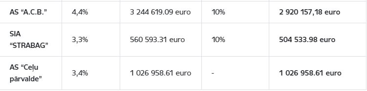 Kā skaidro Konkurences padome, 1. jūnijā pieņemts lēmums, kurā konstatēts trīs ceļu būvniecības uzņēmumu – AS “A.C.B”, AS “Ceļu pārvalde” un SIA “STRABAG” – aizliegtu vienošanos VSIA “Latvijas Valsts ceļi” organizētajos publiskajos iepirkumos par ceļu un maģistrāļu būvniecību Latvijā. Par īstenoto konkurences tiesību pārkāpumu uzņēmumiem piemērots naudas sods kopumā 4 451 649,77 eiro apmērā.