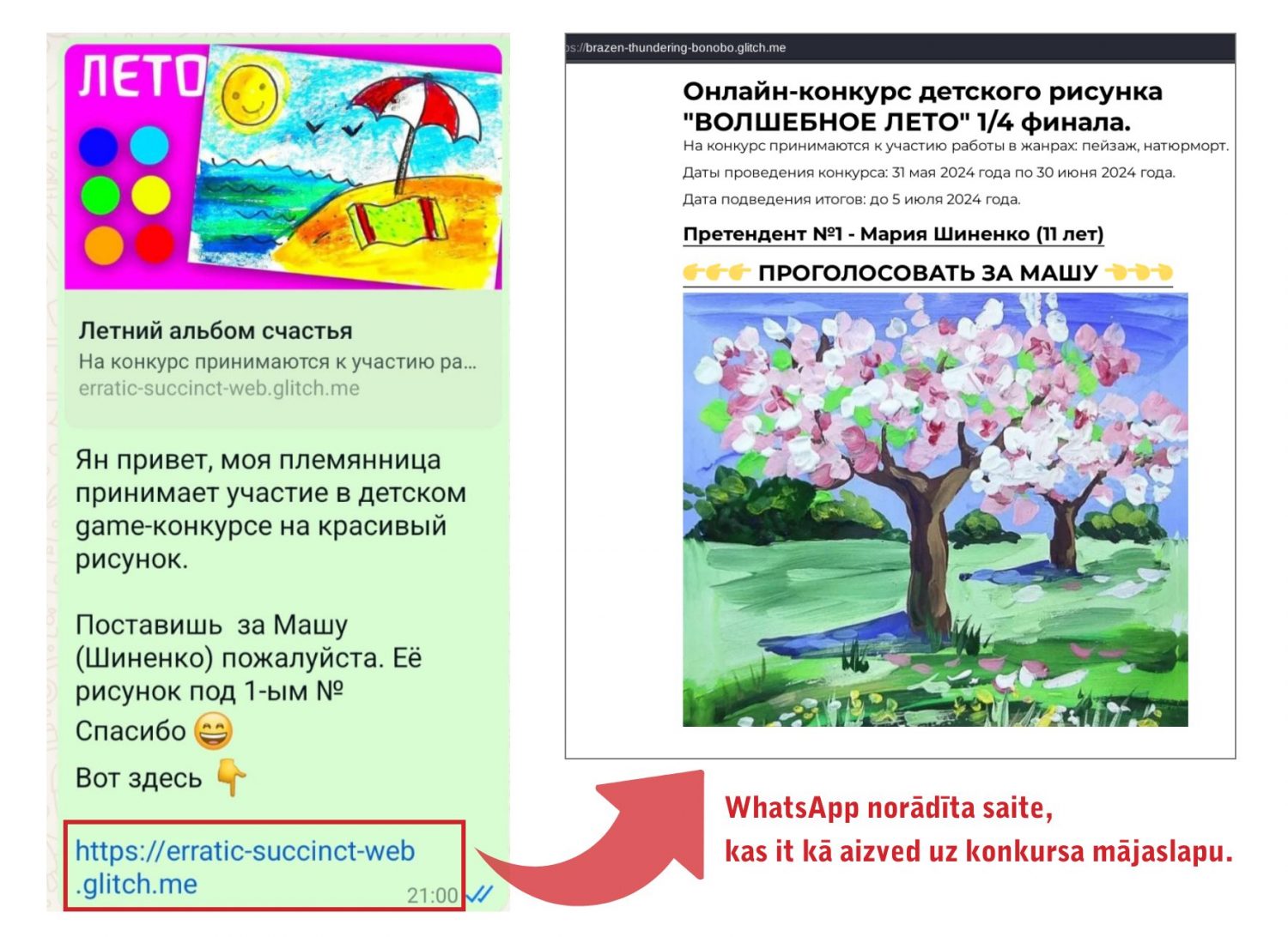 WhatsApp lietotājs šķietami no paziņas vai tuvas personas (kuras konts iepriekš ticis kompromitēts) saņem ziņu ar saiti, kurā tiek aicināts konkursa ietvaros nobalsot par bērna / mazbērna / krustbērna zīmējumu. Atverot atsūtīto saiti, lietotājs nonāk it kā konkursa mājaslapā, kur redzama balsošanas poga, taču uz tās nospiežot, lietotājs tālāk tiek aicināts apstiprināt savu identitāti un autentificēties ar savu WhatsApp kontu. Tiek prasīts ievadīt savu telefona numuru un pēc tam SMS saņemto 6 ciparu kodu. Patiesībā 6 ciparu verifikācijas kods domāts, lai ļaundaris varētu pārnest lietotāja WhatsApp kontu uz citu ierīci / numuru. Iepriekš ir bijuši gadījumi, kad ļaundari gājuši vēl soli tālāk – pēc konta pārņemšanas, iestatījumos tiek uzstādīts PIN kods, kas liedz oriģinālajam īpašniekam atgūt kontu. No nozagtā konta tālāk vart tikt izplatītas krāpnieciskās ziņas kontaktos esošajām personām ar mērķi gūt materiālu labumu.