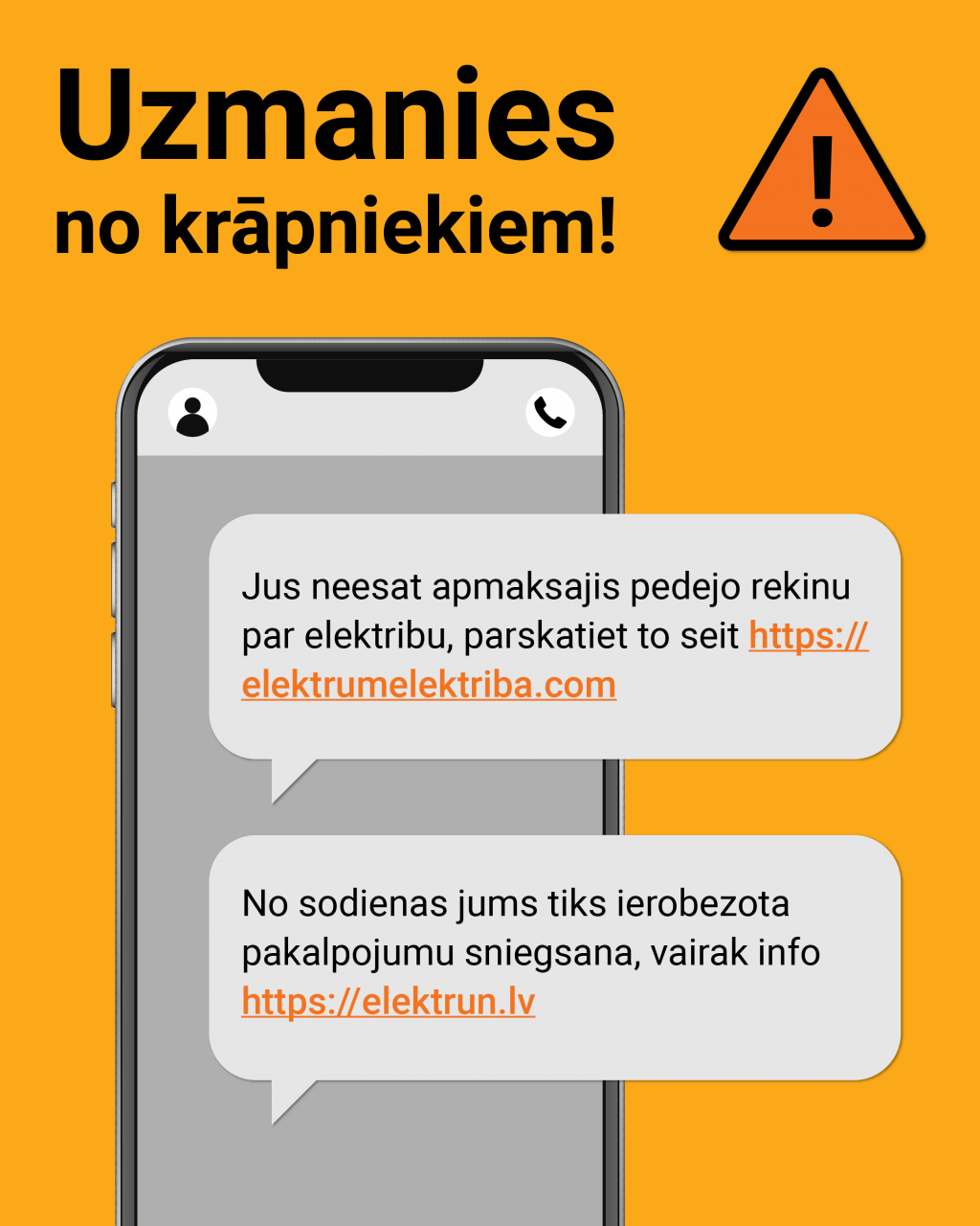Aicinām klientus būt uzmanīgiem! Ja Jums ir šaubas, aicinām sazināties ar Elektrum klientu apkalpošanu pa tālruni 8400 vai e pastā: klientu.serviss@elektrum.lv.