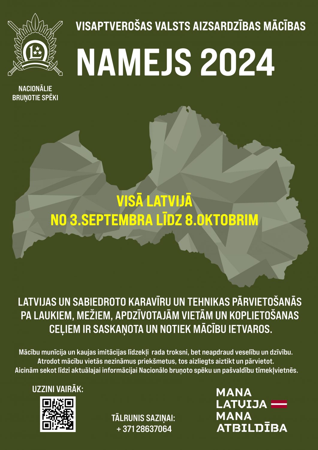 Visā Latvijā rudens periodā intensīvi norisināsies mācības, kuru laikā pa Latvijas valsts galvenajiem un reģionālajiem ceļiem pārvietosies Latvijas un sabiedroto valstu karavīri un militārā tehnika. Mācību uzdevumu izpildes laikā notiks militāro lidaparātu lidojumi Latvijas gaisa telpā, tostarp zemā augstumā, kā arī kaujas šaušana poligonos.
