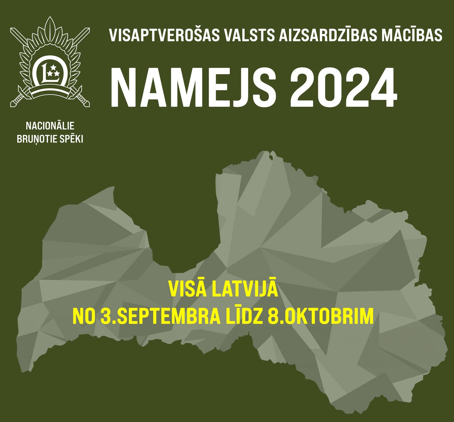 Mācību “Namejs 2024” ietvaros septembrī Nacionālie bruņotie spēki plāno veikt trīs dienu ilgas mobilizācijas mācības ierobežotam personāla skaitam, kuru laikā tiks pārbaudīta mobilizācijas mehānismu darbība to tālākai pilnveidošanai. Mācības notiks Zemessardzes 3. Latgales brigādes atbildības teritorijā.