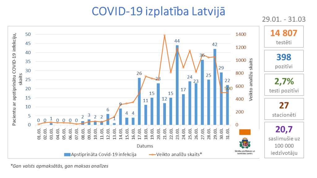Kā ziņots, Covid-19 pēdējā diennaktī apstiprināts vēl 22 cilvēkiem, līdz ar to kopumā ar to valstī saslimuši 398 cilvēki. Patlaban ārstniecības iestādē ir stacionēti 27 Covid-19 pacienti, no viņiem 24 ir ar vidēju slimības gaitu, bet trīs – ar smagu.