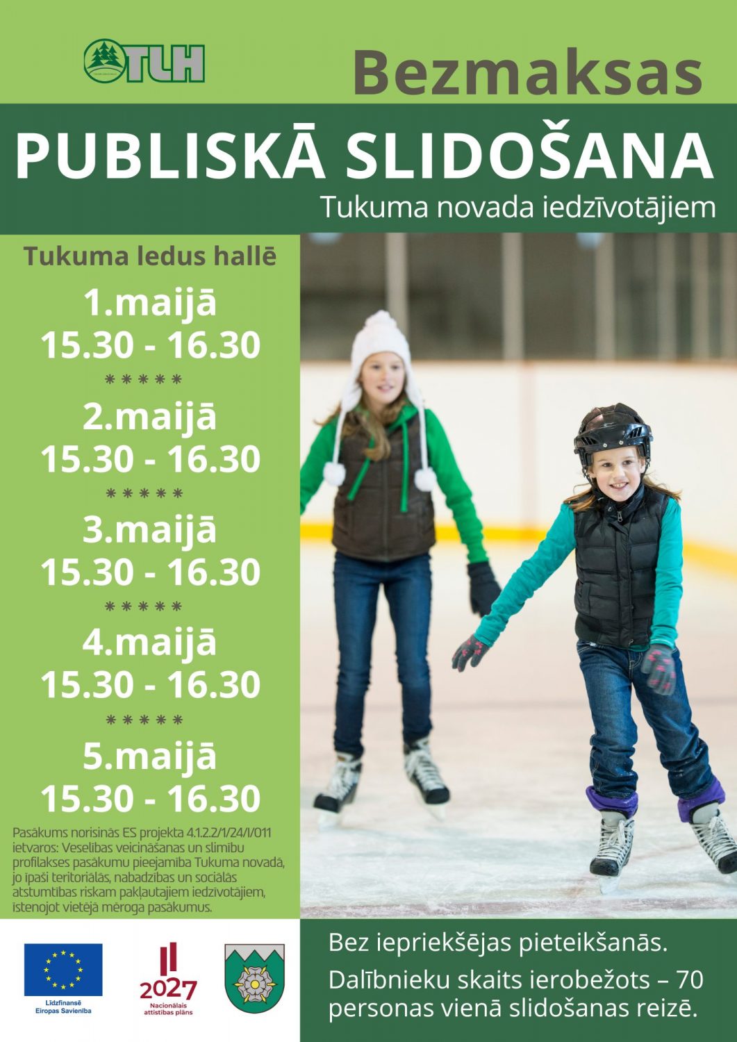 Dalībnieku skaits slidošanas nodarbībās ir ierobežots – 70 personas vienā slidošanas reizē. Nodarbības uzraudzīs un kārtību slidošanas laikā nodrošinās Tukuma ledus halles pārstāvis.