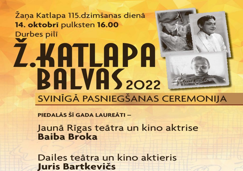 14. oktobrī 16.00, aktiera, režisora un teātra pedagoga Žaņa Katlapa 115. jubilejā, Durbes pilī tiks pasniegta balva par nacionālo vērtību apliecinājumu Latvijas teātra un kino vidē. Šogad to saņems Dailes teātra un kino aktieris Juris Bartkevičs un Jaunā Rīgas teātra un kino aktrise Baiba Broka. Pasākumā muzicēs čellists un komponists Kārlis Auzāns.