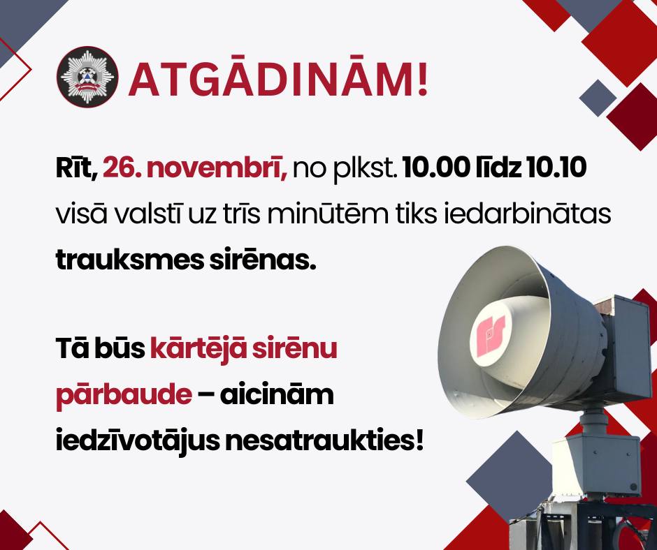 Ukrainas civiliedzīvotājiem, kuri atrodas Latvijas teritorijā, mobilo sakaru operatori no 19.novembra nosūtīs SMS ar informāciju, ka 26.novembrī notiks plānota trauksmes sirēnu pārbaude. Aicinām iedzīvotājus un plašsaziņas līdzekļus dalīties ar pielikumā atrodamo plakātu, kas ir izveidots ukraiņu valodā, lai pēc iespējas vairāk Ukrainas civiliedzīvotāju uzzinātu par šo pārbaudi un nerastos lieki satraukumi.