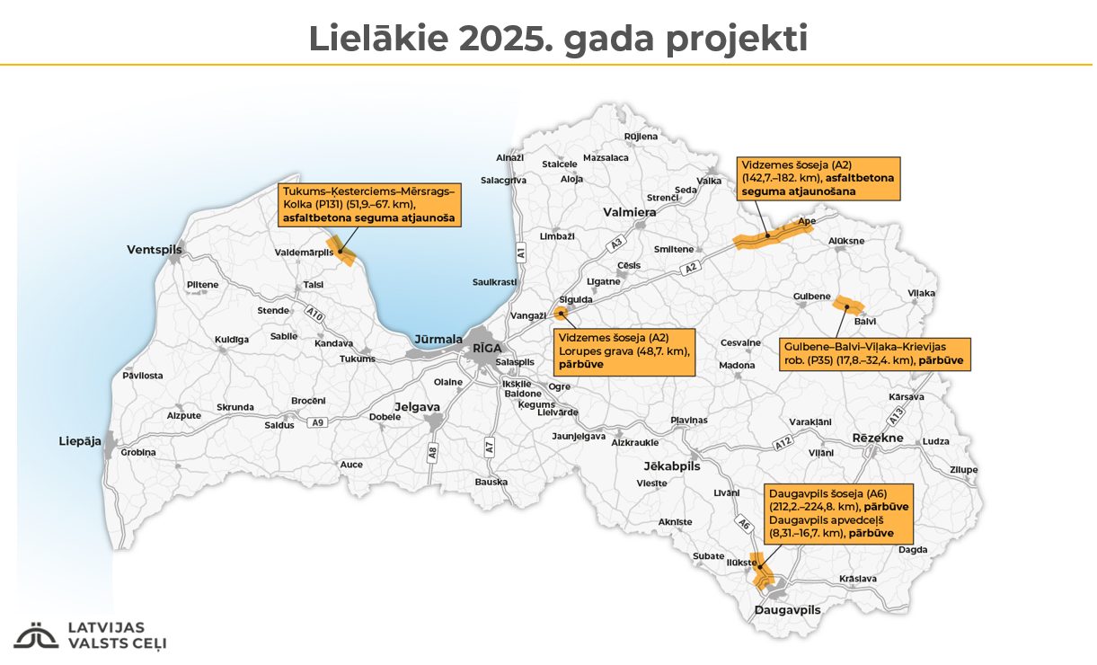 - Vidzemes šosejas (A2) seguma atjaunošana no Grundzāles līdz Jaunlaicenei (142,7.–182. km);