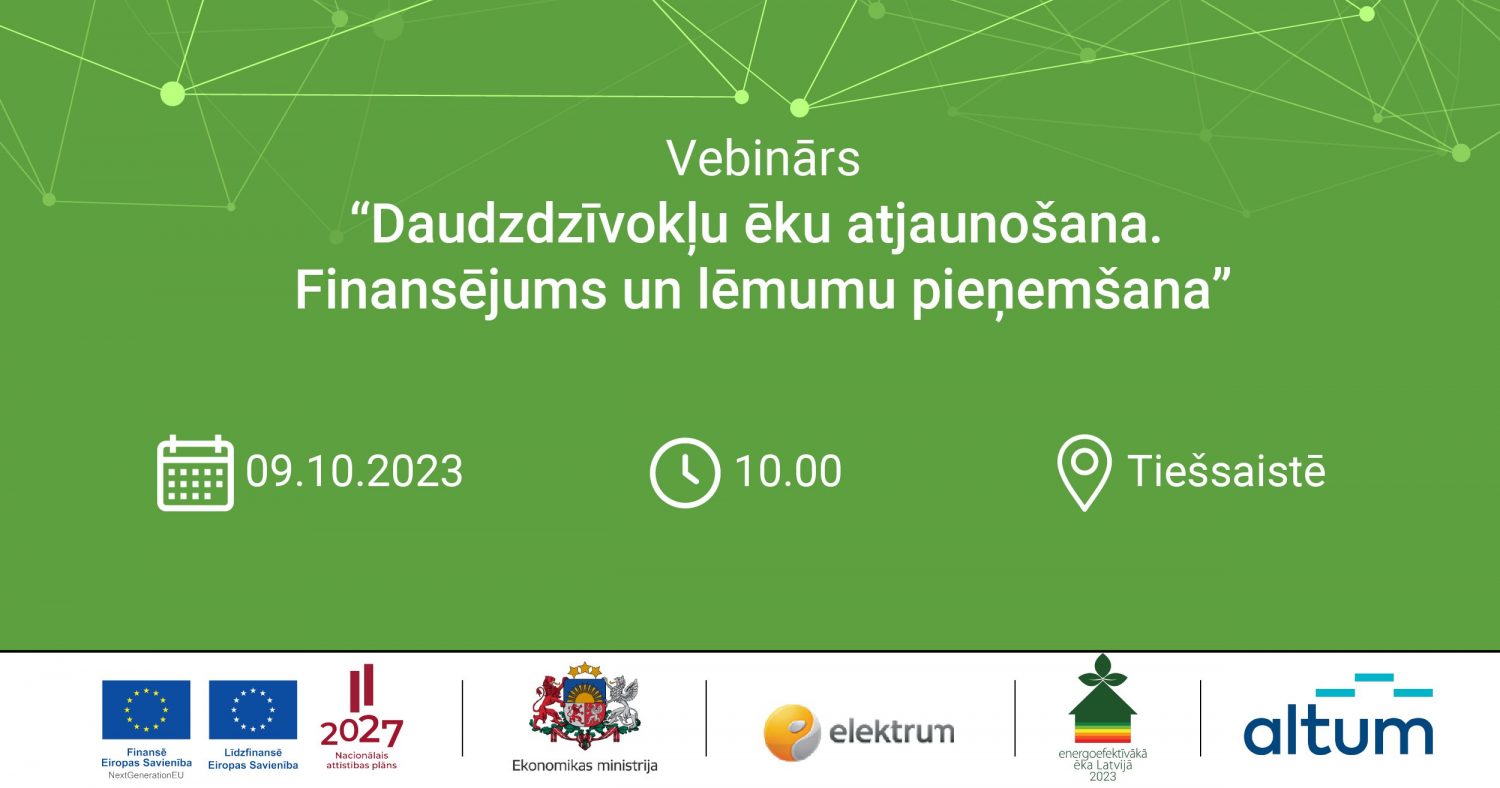 Šā gada 9. oktobrī Ekonomikas ministrija, Elektrum Energoefektivitātes centrs un Attīstības finanšu institūcija Altum aicina piedalīties vebinārā “Daudzdzīvokļu ēku atjaunošana. Finansējums un lēmumu pieņemšana”. Pasākuma mērķis ir informēt atbalsta saņemšanas iespējām un nosacījumiem daudzdzīvokļu ēku atjaunošanai.