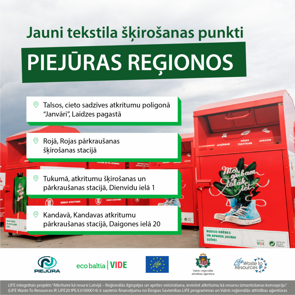 Lai mazinātu apģērba, apavu un mājas tekstila nonākšanu poligonos un veicinātu, ka pēc iespējas lielāka daļa tekstiliju nonāk atkārtotā apritē, SIA “Eco Baltia vide” kopā ar partneriem, tostarp SIA “Atkritumu apsaimniekošanas sabiedrība “Piejūra”” turpina strādā pie tekstila šķirošanas sistēmas izveides Latvijas reģionos. Šobrīd iedzīvotājiem visā Latvijā pieejami jau vairāk nekā 120 tekstila šķirošanas konteineri, kuru atrašanās vietas iespējams atrast Latvijas Zaļā punkta interaktīvajā atkritumu šķirošanas vietu kartē – ŠEIT.