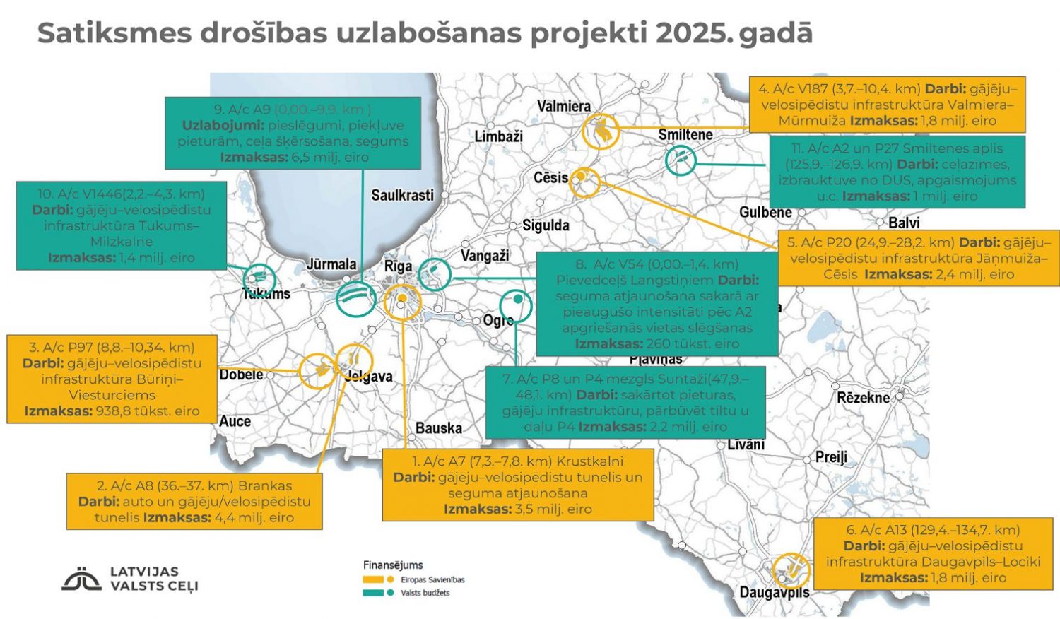 Uzlabojot satiksmes drošību, šogad valsts ceļu tīklā septiņās vietās plānots izbūvēt infrastruktūru gājējiem un velosipēdistiem, četrās no tām būvdarbi notiks ar ES KF līdzfinansējumu: