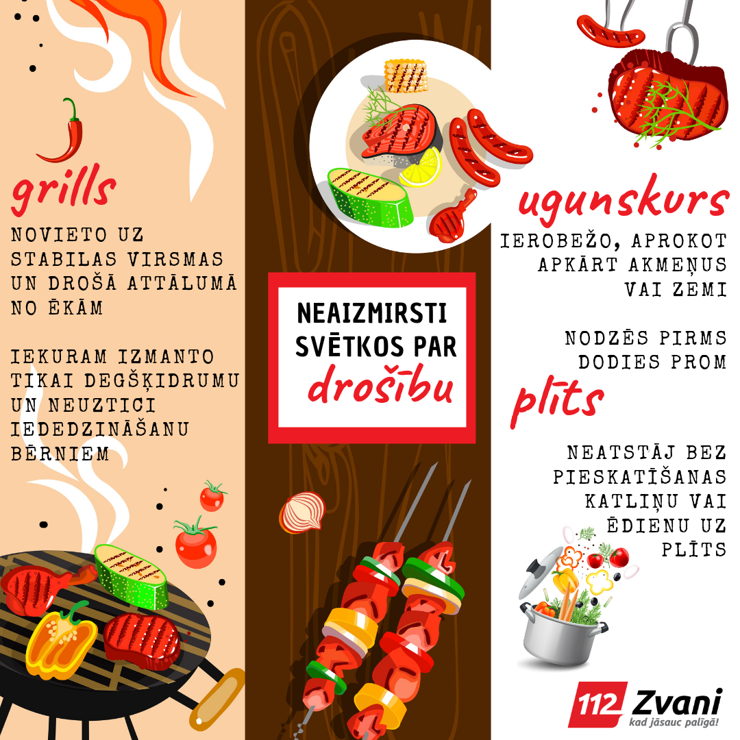 Brīvdienās meteorologu prognozētie siltie laikapstākļi cilvēkus mudinās arī uzsākt grila sezonu. Aicinām iedzīvotājus, kurinot grilus, būt uzmanīgiem un neaizmirst, ka dārzu un privātmāju pagalmos grils ir jānovieto uz stabilas virsmas un drošā attālumā no ēkām, lai, uzpūšot stiprākam vējam, dzirksteles nevarētu izraisīt ugunsgrēku. Iekurinot grilu, ir jāizmanto tikai tie degšķidrumi, kuri ir paredzēti šim mērķim, nevis, piemēram, benzīns vai acetons, jo, tam uzliesmojot, cilvēks var gūt smagus apdegumus. Pirms grila aizdedzināšanas, kurināmais jāaplej ar degšķidrumu, jāpagaida, kamēr tas sasūksies un tikai tad uzmanīgi jāaizdedzina. Līdztekus VUGD aicina grila iededzināšanu nekādā gadījumā neuzticēt bērniem, jo pat pieaugušo klātbūtnē viņiem to darīt var būt bīstami.