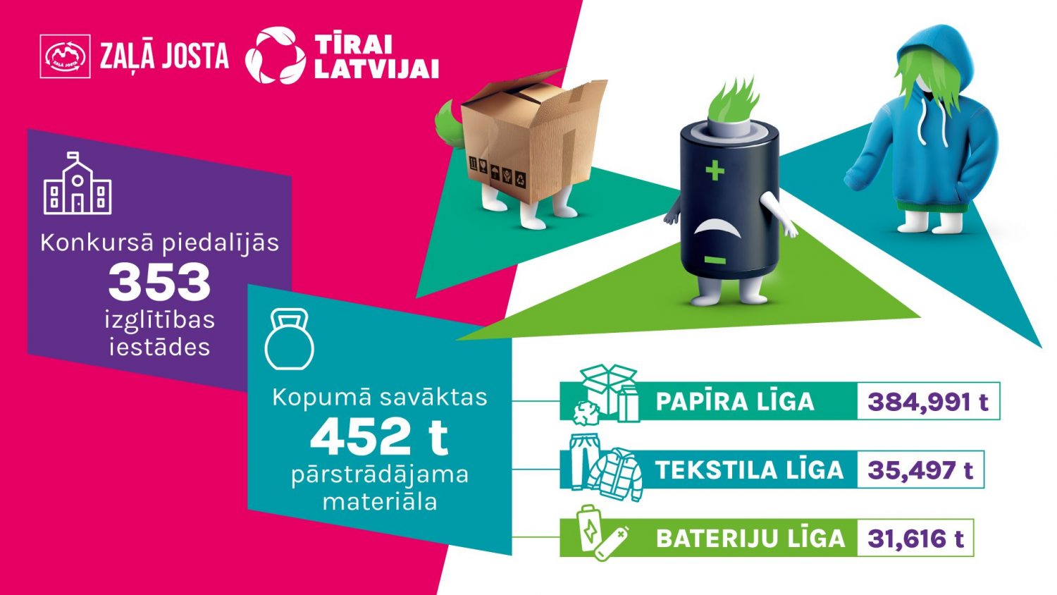 Šogad, piedaloties kopumā 353 pirmsskolas, vispārējām, profesionālās un interešu izglītības iestādēm, no 2024. gada oktobra līdz 2025. gada martam savākti un nodoti tālākai pārstrādei 384,9 tonnas papīra, 35,4 tonnas tekstila un 31,6 tonnas izlietoto bateriju.