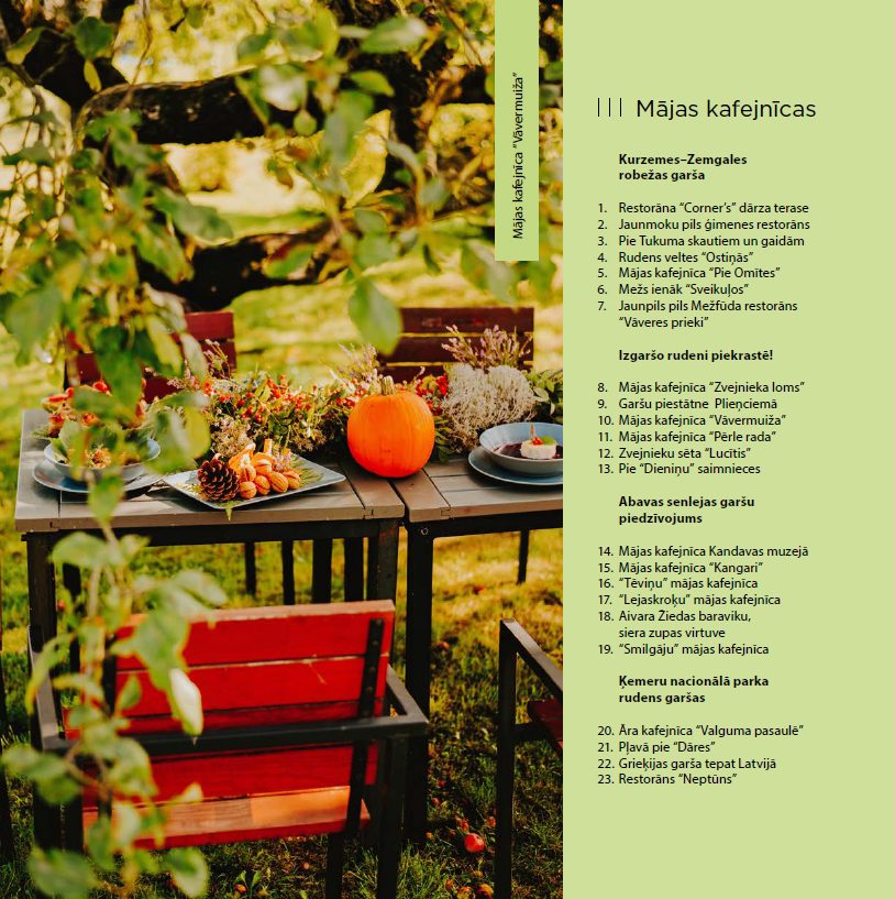 Mājas kafejnīcu dienās te tuvākā un tālākā apkārtnē varēs baudīt patiesus gardumus no meža un laukiem. Būs gan kūpinājumi un žāvējumi, gan augļi un dārzeņi, ķirbji un sēnes. Būs arī īsti latviski ēdieni. Bet, ja paliksiet Kandavā, tad vietējā muzejā varēsiet nobaudīt īstu ozolzīļu kafiju.
