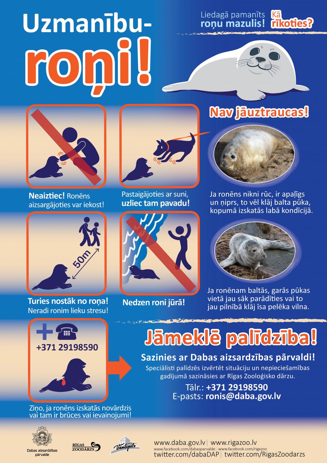 Video pamācība, kā rīkoties sastopot roņu mazuli:https://www.youtube.com/watch?time_continue=1&v=BpqN-gjrPpM