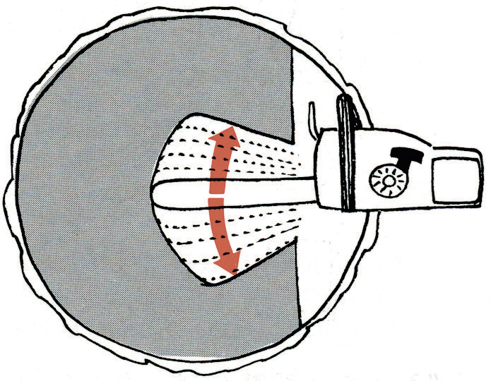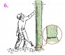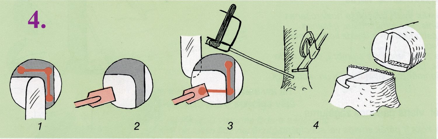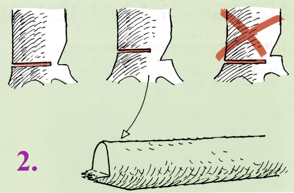 1. Ja koks ir pietiekami viegls, tad apmēram 2 cm zem zāģējuma līnijas izdariet vēl vienu iezāģējumu ar sliedes galu, ievietojiet tur lāpstiņu un tad gāziet koku, izmantojot izdevīgāku vēja brāzmu. (6. zīm.)