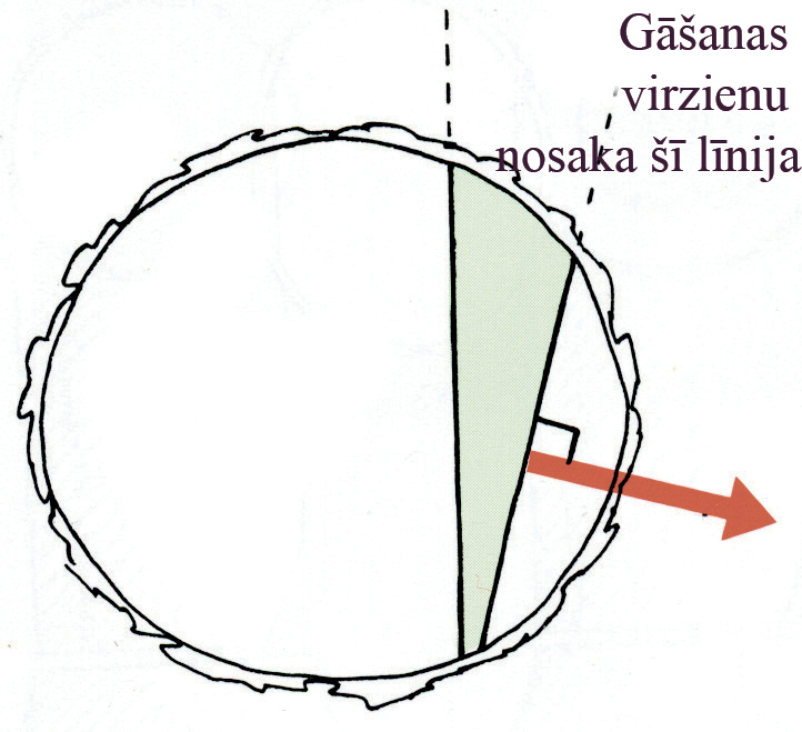 2. Ja koks ir mazāk nosvēries vai gāšanas virzienā ir spēcīgs vējš, tad zāģēt var šādi: vispirms izdara zāģējumu stumbrā līdz nepārzāģētajai josliņai un pēc tam