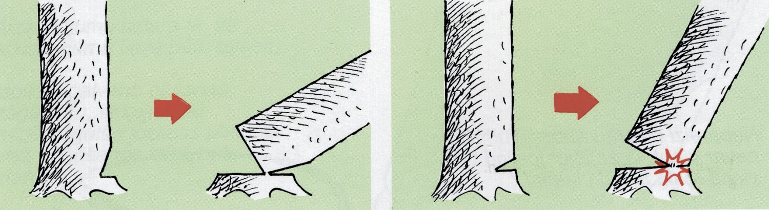 Šādā situācijā nereti koku nevar gāzt ar parastiem paņēmieniem, jo stumbrs var pāršķelties un dot bīstamu atsitienu uz augšu.