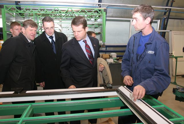 Ar SIA «Skonto plan Ltd.» logu ražotni vēstnieku iepazīstināja kompānijas īpašnieks Guntis Rāvis un Tukuma ražotnes vadītājs Ainārs Birkmanis. Č. Larsons atzina, ka šī joma viņu interesē, jo arī viņa draugs ASV nodarbojas ar logu ražošanu, turklāt līdzīgi kā uzņēmumi Latvijā, piedzīvo lejupslīdi. Viņš interesējas par logu izgatavošanas procesu un ar interesi vēroja modernās un gandrīz pilnībā automatizētās stikla apstrādes līnijas darbu. Pēcpusdienā vēstnieks apskatīs Tukuma bibliotēkas telpas, iepazīsies ar apkures katlu ražotni a/s «Komforts», kā arī tiksies ar uzņēmējiem un sniegs nelielu interviju arī «Neatkarīgo Tukuma Ziņu» redakcijā.