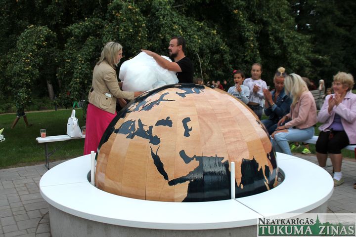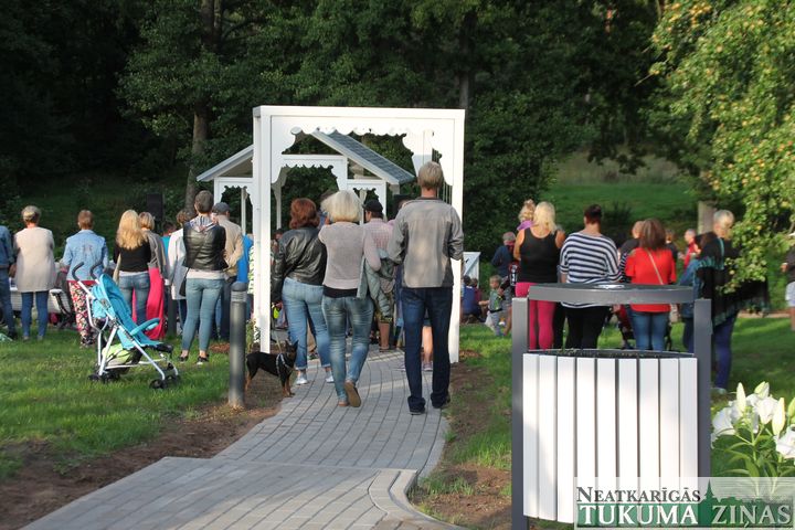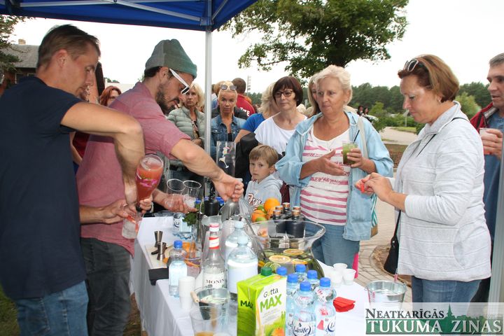 Atnākušos pie pašas ieejas gaidīja telts, kur, kā vēlāk noskaidrojām, «Engure Cafe» prasmīgākie kokteiļu jaucēji mudināja klātesošos vispirms nogaršot un pēc tam nobalsot par sev tīkamāko vasarīgo brūvējumu. Tā nu ar krāsainu dzērienu rokās kādu brīdi bija iespēja savā vaļā novērtēt parkā paveikto. Balti soliņi, norādes, kas vēstī, kurā virzienā un kādā attālumā atrodas citas ar jūrskolu saistītas vietas (piemēram, Valdemārpils, kas ir K. Valdemāra dzimtā vieta), smalkas, kokā grebtas arkas, kas, nokāpjot pa trepītēm, ved līdz tādos pašos toņos ieturētai terasei. Pirmā doma, kas pavīd, terasi lūkojot, ir nelielas, romantiskas laulību ceremonijas, kas te kaut kad nākotnē varētu notikt. Un, kā izrādās – ne velti tādas domas prātā šaujas! Saieta nama vadītāja Jolanta Kraukle atklāšanā pastāstīja, ka tieši tāda arī bijusi sākotnējā iecere, kad vēl tikai pārrunājuši, kādam būt un kam turpmāk kalpos parka iekārtojums. Un, kā tika solīts – tiem engurniekiem, kas kā pirmie sadomās izmantot šīs jaunradītās vietas priekšrocības, pati laulību ceremonija būšot bez maksas…