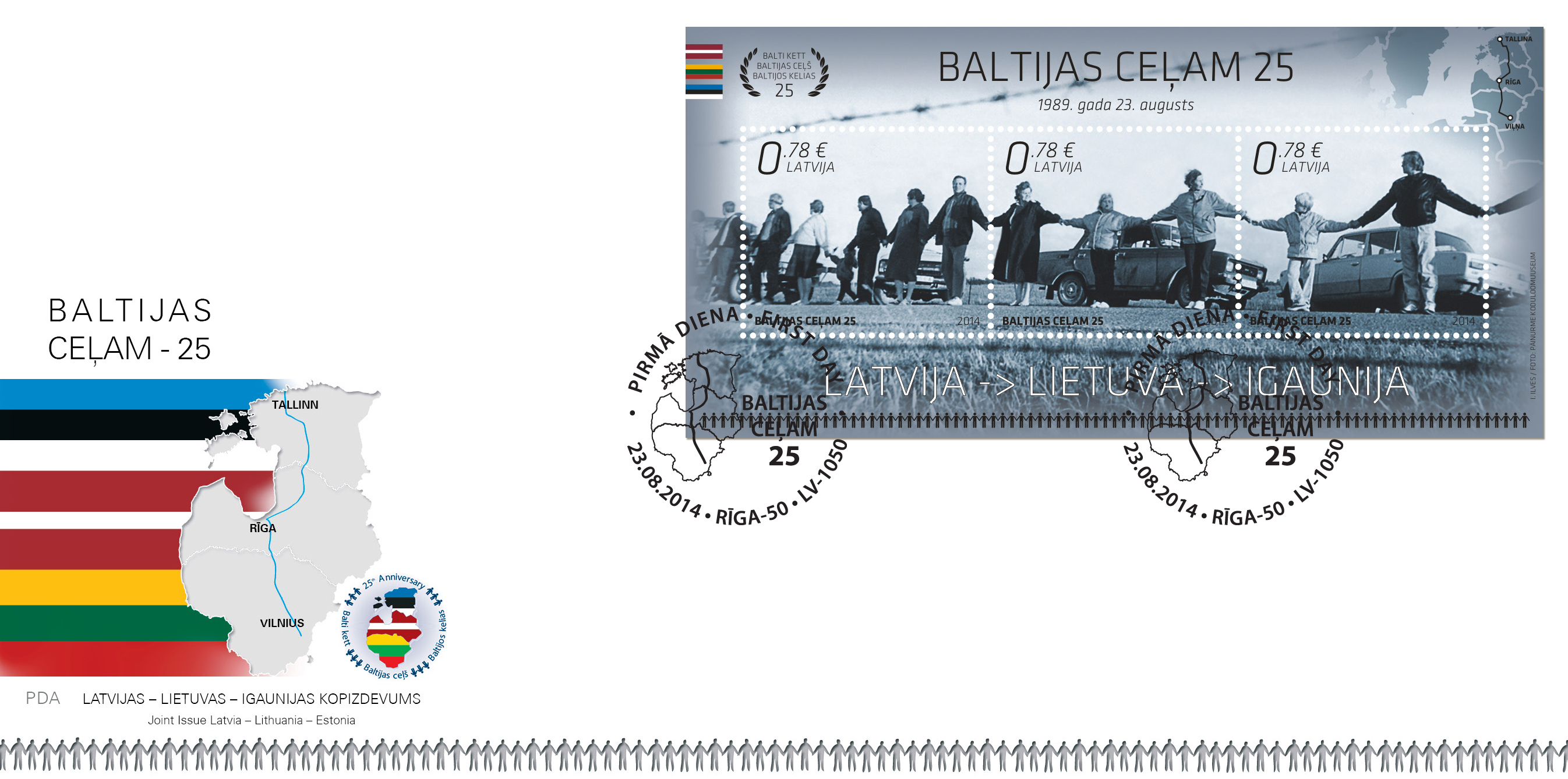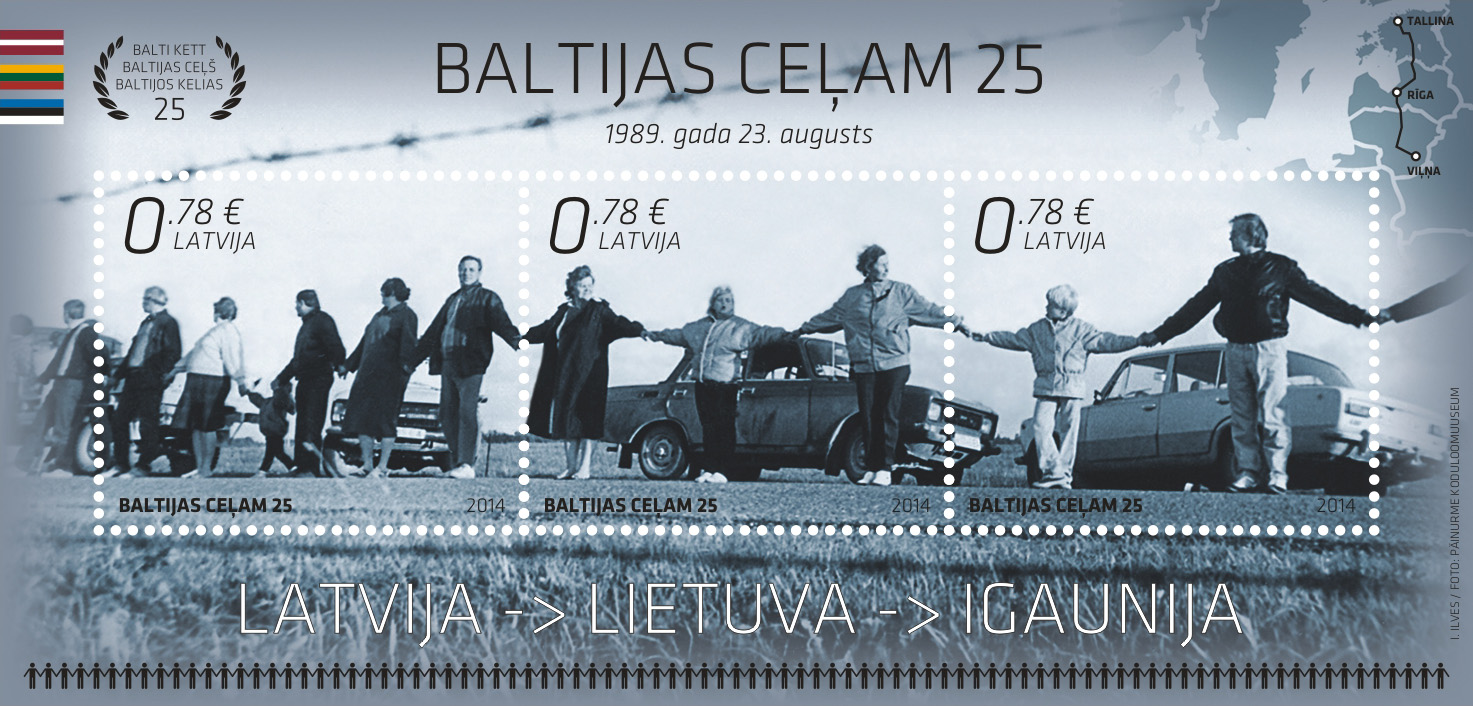 Atzīmējot vēsturiskās Baltijas ceļa akcijas 25.gadadienu, trīs Baltijas valstu pasta uzņēmumi vienlaikus izdod šim notikumam veltītas pastmarkas un pastmarku bloka kopizdevumu. Katras valsts pastmarka veido vienu fragmentu no Baltijas ceļa ķēdes, un pastmarku blokā šie trīs fragmenti savienojas vienotā attēlā. Jauno pastmarku pirmās dienas zīmogošana notiks 2014.gada 23.augustā Latvijas Tautas Frontes muzejā, Vecpilsētas ielā 13/15, Rīgā, no plkst.9 līdz 17. Baltijas ceļa pastmarkas un īpašā aploksne ar pirmās dienas zīmogu tiks prezentēta arī trim Baltijas valstu premjerministriem atceres pasākumu laikā 23.augustā.