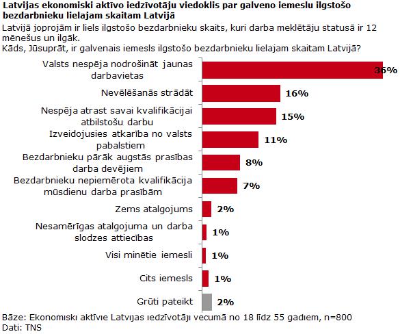 Trešā daļa (36%) Latvijas ekonomiski aktīvo iedzīvotāju vecumā no 18 līdz 55 gadiem kā galveno iemeslu ilgstošo bezdarbnieku lielajam skaitam Latvijā min valsts nespēju nodrošināt jaunas darbavietas. Salīdzinoši biežāk starp šādu atbildi sniegušajiem ir cittautieši, Latgales reģiona iedzīvotāji, nepilsoņi, iedzīvotāji ar salīdzinoši zemiem mēneša ienākumiem.