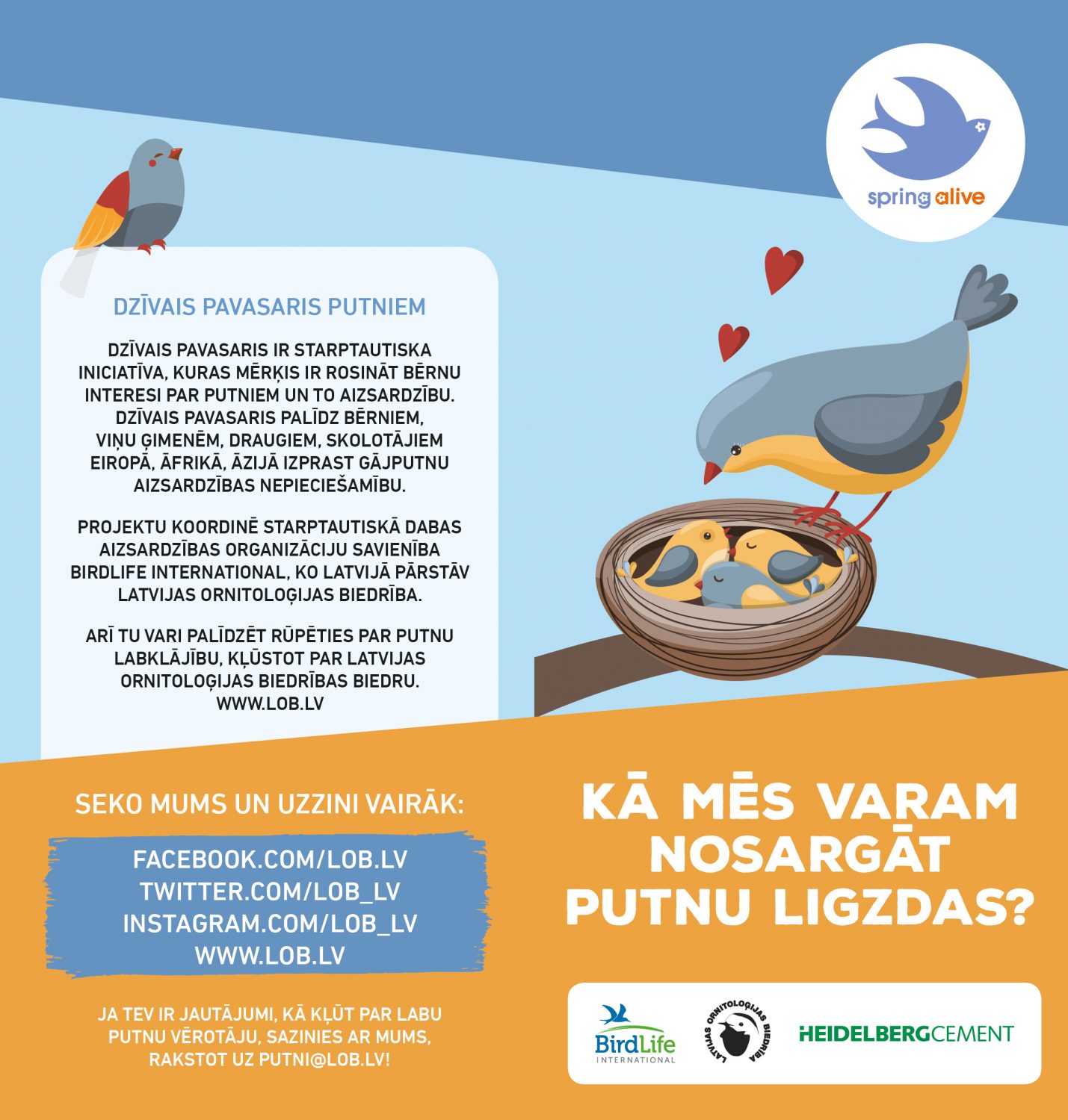 Projektu vienpadsmito gadu koordinē starptautiskā dabas aizsardzības organizāciju savienība “BirdLife International”, ko Latvijā pārstāv Latvijas Ornitoloģijas biedrība. Projekta īstenošanu jau trešo gadu finansiāli atbalsta “BirdLife International” sadarbības partneris – starptautiskais uzņēmums “HeidelbergCement”. Plašāk: www.springalive.net.