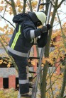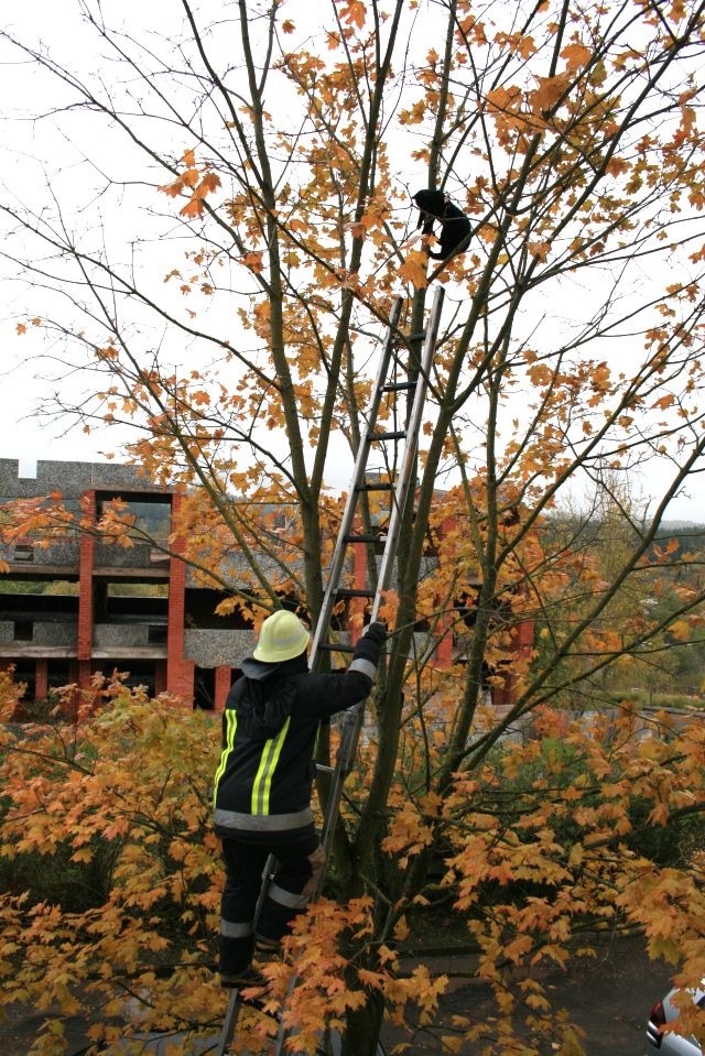 Visi mēģinājumi sasaukt, aizgaiņāt vai kā citādi nodabūt kaķi lejā no koka bija beigušies neveiksmīgi. Tas neizdevās arī kādam puisim, kurš gāja garām un piedāvājās uzkāpt kokā un kaķi nocelt. Kaķis izrādījās pārāk nesasniedzams. Tāpēc uzņēmīgi cilvēki ierosināja talkā aicināt Valsts ugunsdzēsības un glābšanas dienestu (VUGD). Kad ar dienestu sazinājušies, uzzinājuši, ka krīzes laikā dzīvnieku glābšanai vairs naudas nav, tāpēc ar kaķu nocelšanu dienests nodarboties nevar. Tomēr priekšnieks Dainis Bērziņš solījis kaut ko izdomāt. Un pēc neilga laika ieradušies VUGD vīri, kas bija atbraukuši ar personīgo auto un saliekamajām kāpnēm, un kaķi no koka nocēluši. Paldies viņiem!