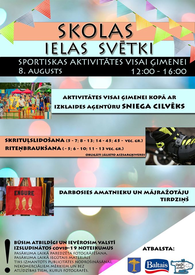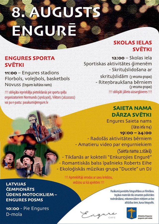 Savukārt sestdien, 8. augustā visas dienas garumā tiks svinēti Engures pagasta svētki. Jau no pulksten 10.00 pie Engures mola norisināsies Latvijas čempionāts ūdens motocikliem, savukārt no pulksten 11.00 Engures stadionā norisināsies Sporta svētki, kur notiks sacensības dažādos sporta veidos. Pulksten 12.00 visi laipni aicināti uz Skolas ielas svētkiem. Kur notiks dažādas aktivitātes ģimenēm kā arī darbosies mājražotāju un amatnieku tirdziņš. Vakarpusē no pulksten 19.00 norisināsies Saieta nama svētki. Šeit tiks piedāvātas dažādas radošas aktivitātes bērniem, tikšanās ar kokteili “Engurojies Engurē”, kā arī uzstāsies Roberts Eihe un ekoloģiskā mūzikas grupa “Ducele”. Aicinājums apmeklētājiem ņemt līdzi savu krēslu vai pledu sēdēšanai brīvdabā. Norises vieta: Engure, Engures pagasts, Tukuma novads. Vairāk informācijas www.enguresnovads.lv