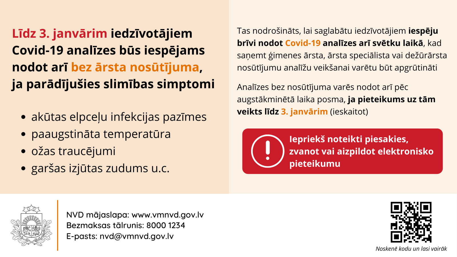 NVD jau vēstīja, ka līdz 3. janvārim Covid-19 analīzes, ja parādījušies saslimšanas simptomi, var nodot bez ārsta nosūtījuma. Informācija par analīžu nodošanas punktiem un darba laikiem pieejama NVD interaktīvajā kartē “COVID-19 analīžu nodošanas vietas Latvijā”.