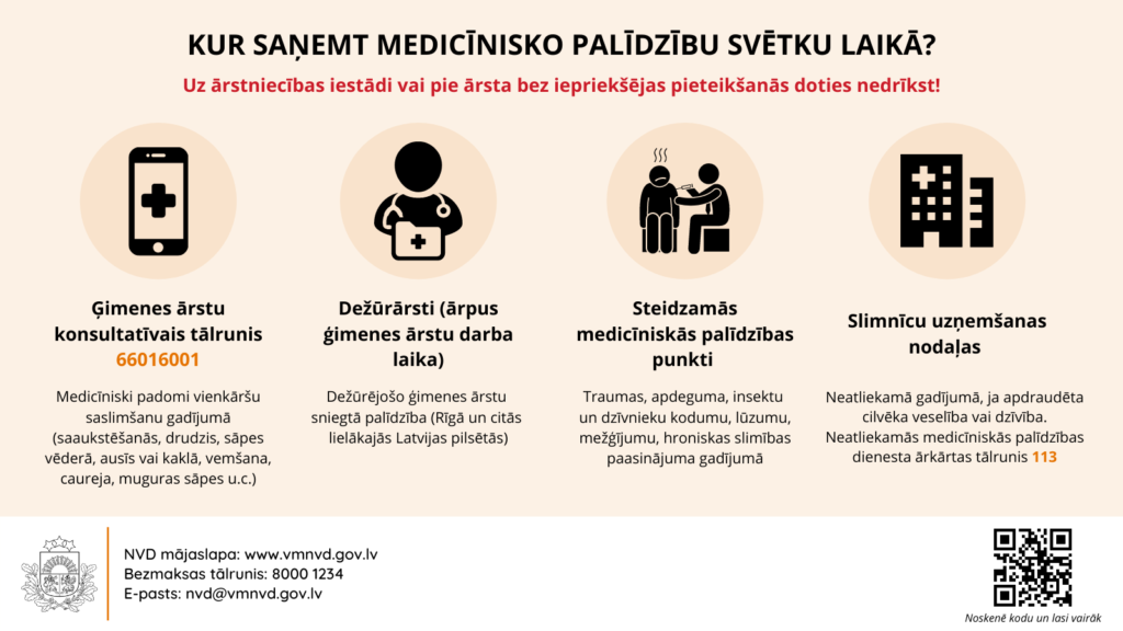 Informācija par pieejamo veselības aprūpes pakalpojumu sniedzēju darba laiku svētku nedēļu laikā pieejama Nacionālā veselības dienesta (NVD) mājaslapas sadaļā – “Kur saņemt medicīnisko palīdzību?” Tāpat informācija par dežūrārstu, steidzamās medicīniskās palīdzības punktu un slimnīcu uzņemšanas nodaļu atrašanās vietu, darba laiku apkopota interaktīvā kartē, kas pieejama NVD mājaslapā.