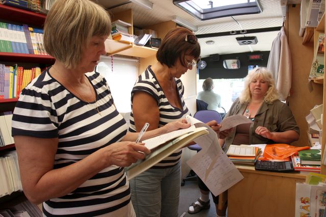 Bērni un mammas kāpa busā, kur darbinieces Anita Rimša un Rūta Kupene palīdzēja katram sameklēt skolai nepieciešamās grāmatas. Mammas, bērni pašaurā busa ejā starp grāmatu plauktiem meklēja īsto izdevumu, taču vai visas gribējās ar acīm noglāstīt, aptaustīt un sajust, kā smaržo. Tā, kā tikai grāmatas to prot… Viena otra mamma izkāpa no busa ar grāmatām pilniem plastmasas maisiem, knapi rokās varēja noturēt, savukārt bērni tās turēja kā gaišumiņus cieši piespieduši pie auguma. Todien pie misijas stāvēja rinda vieglo automašīnu, ne jau "biezas", vienkāršākas, jo auto ir dzīves nepieciešamība, īpaši, ja kupla ģimene… Mammas, tēti vēra vaļā bagāžas tilpnes, lika iekšā drēbes, apavus, bet grāmatas gan turēja klēpī. Tā esot svēta lieta, nedrīkstot šurpu turpu mētāt.
