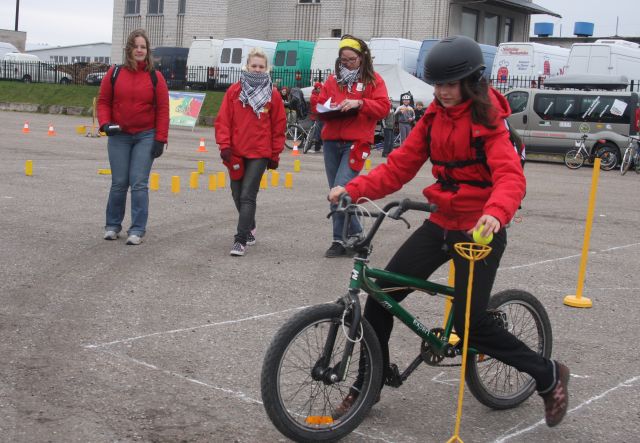 Pirms traukšanās trasē tiesneši katram dalībniekam uzlika mugursomu. Pārbaudīja, vai galvā cieši ķivere, un tikai tad, komandas biedru uzmundrināti, braucēji lavierēja šauro taciņu starp koka klucīšiem. Mazāk apgāzīs – vairāk punktu. Praktiskajā daļā veica divas šķēršļu joslas. Teorētiskajā: jāzina ceļu satiksmes noteikumi, velosipēda uzbūve, kopšana un jāprot sniegt pirmo palīdzību.