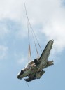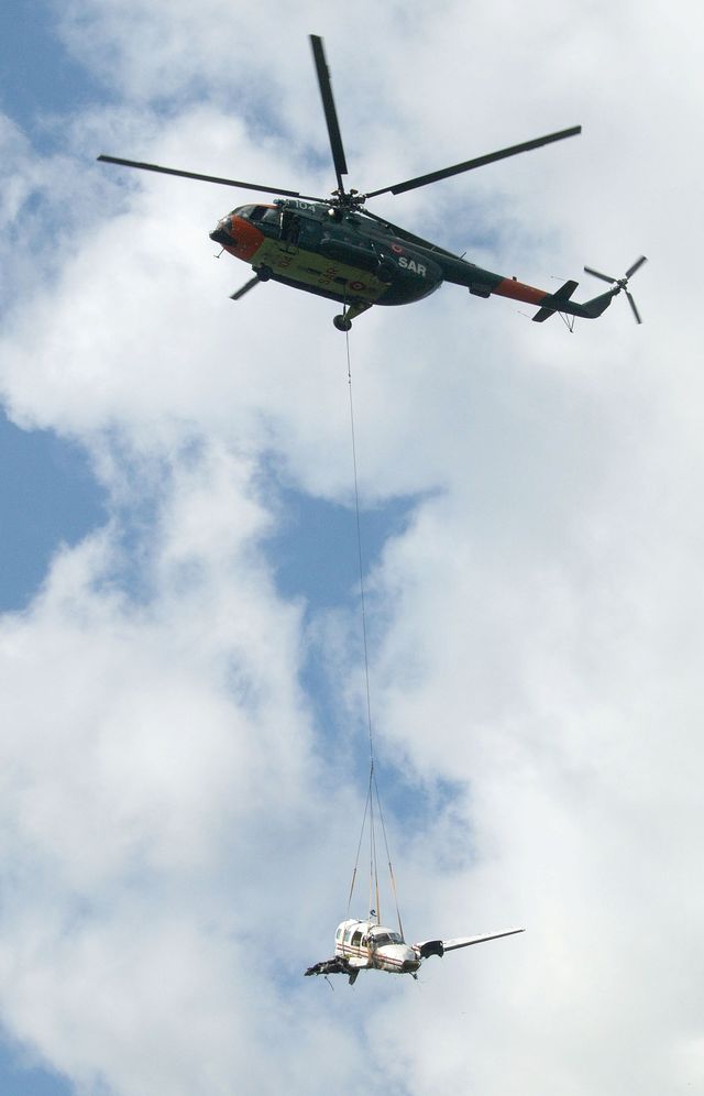 Tomēr tik traki nebija. Helikopters atlidoja pēc 10.30 un vēl pēc nepilnas stundas sākās daļu aizvešanas operācija. No malas raugoties, viss šķita vienkārši – daļa no lidmašīnas tika piekabināta apmēram 20 m garai trosei un, neraugoties uz stipro vēju, aiztransportēta Tukuma lidlauka virzienā. Bija redzams, ka helikopters savā ceļā izvairās no apdzīvotām vietām. Atgriešanās pēc nākamās daļas notika samērā ātri – pēc nepilnām desmit minūtēm.