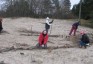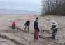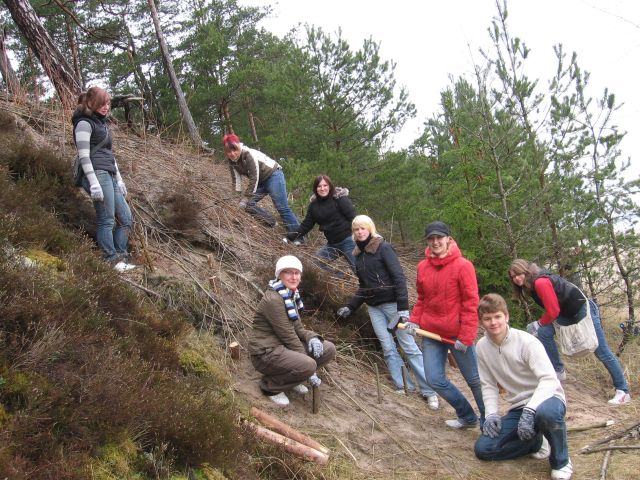 Izgājuši cauri interesantam priežu biotopam ar vecām žuburainām priedēm, kurās mājvietu rod putni, šķērsojot kāpu, nonācām pludmalē, no kuras redzams, kā skolēni izbradātās stāvās kāpas nogāzes nostiprināja ar kārklu pinumiem un stādījumiem. Cita skolēnu grupa strādāja Plieņciema Baltajā kāpā. Šie paši skolēni jau agrāk gar Balto kāpu – gar taku uz pludmali – bija veidojuši zaru pinumus. Kārklu zarus kāpu nostiprināšanai ņem no tuvējiem kāpā augošajiem kārkliem, kurus apgriež. Tie savukārt turpmāk augs kuplāki un kopā ar jaunajiem pinumiem vēl labāk aizturēs vēja nestās smiltis, lai tās netiktu pūstas tālāk ciema virzienā. Ar pinumiem iezīmējot taku malas, domāts organizēt atpūtnieku plūsmu.