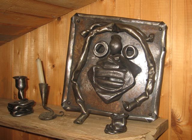 "Manuprāt, rūpnieciski ražotās lietas cilvēku neuzrunā. Man patīk raupjas lietas. Lūk, vienkārša metāla caurule, bet nedaudz saplacināta, tā pārvērtusies par svečturi ar senatnes noskaņu," savus darbus rāda Gints. Turpat līdzās – lielāks darbiņš, ko Gints nosaucis par «Kapilāriem». To skatot, droši vien katram radīsies citādas emocijas. Bet Gintam reiz bijusi pēkšņa nepieciešamība izpausties, un tā – aizgūtnēm strādājis, kamēr darbs gatavs. Interesants ir arī viņa gatavotais suns, pelnu trauks, vizītkaršu turētājs, sienas dekors – medījums un citi. Viņš savam priekam iegādājies arī kolēģu gatavotās atjautības spēles, kur jāprot atkabināt divus metāla priekšmetus vienu no otra, turklāt šis spēles ir trīs dažādos variantos.