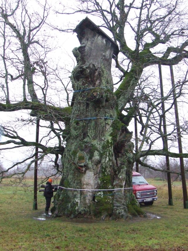 Šeit zariem stutes saliktas, un tas ir labs pasākums, jo redzam, ka zarus no stumbra puses nekas īsti vairs nesatur – tas ozolam vismaz kādu laiku palīdzēs (normāli jau kokiem atsaites liek no galotnes uz leju); laba lieta arī jumtiņš galotnē – vismaz lietus nelīst iekšā. Tās štropes, kas apjoztas stumbram, manuprāt, gan neko nenoturēs, ja zari sadomās lūzt. Vēl – metāla skavas ap zariem gan vajadzētu ik pa laikam atbrīvot, jo koks turpina augt un skavas sāks zarus žņaugt; var redzēt, ka dažviet mizā iespiedušās jau diezgan stipri.