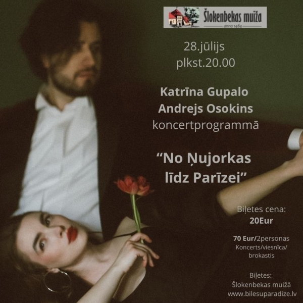Savukārt Šlokenbekas muižā trešdienas, 28.jūlija vakarā visus priecēs Katrīna Gupalo un Andrejs Osokins koncertprogrammā “No Ņujorkas līdz Parīzei”. Programmā spilgtākie priekšnesumi no dziedātājas Katrīnas Gupalo un pianista Andreja Osokina veidotajām izrādēm “100 gadi ar Piafu” un “After Midnight / Pēc Pusnakts”. Biļetes nopērkamas biļešu paradīzes kasēs. Adrese: Šlokenbekas muiža, Milzkalne, Smārdes pagasts, Tukuma novads. Vairāk informācijas pa tālruni 28301020, www.facebook.com/SlokenbekasMuiza