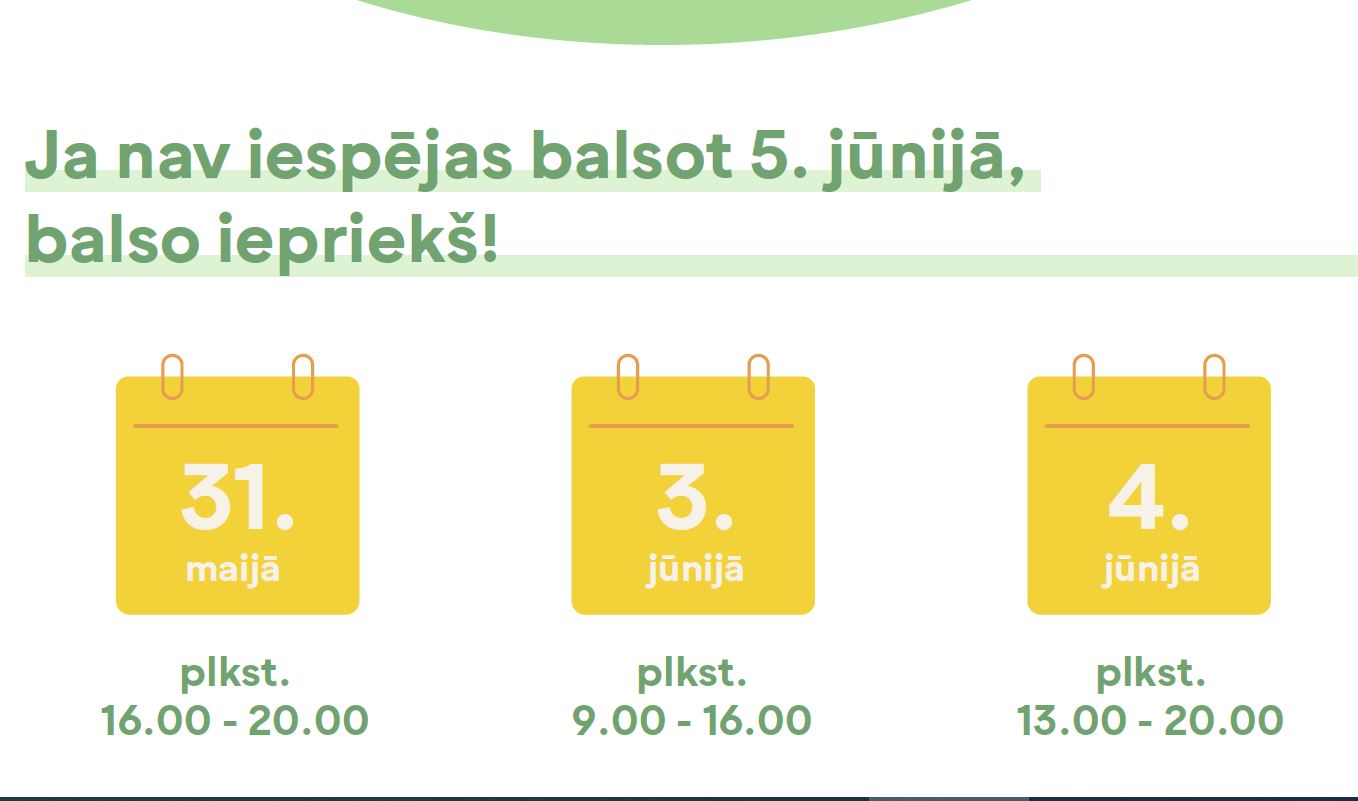 Ja vēlētājam nebūs iespēja nobalsot vēlēšanu dienā, 5. jūnijā, tad pašvaldību vēlēšanās noteiktos laikos to varēs izdarīt iepriekšējās balsošanas dienās – 31. maijā, 3. un 4. jūnijā. Šo iespēju īpaši aicināti izmantot vēlētāji, kuri ir Covid-19 riska grupā, jo iepriekšējās balsošanas dienās iecirkņos parasti ir mazāks balsotāju skaits.