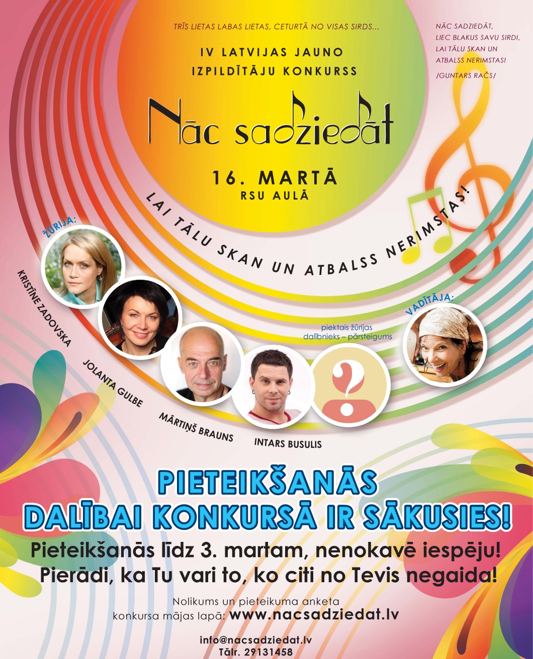 Skanīgas balsis ir atnesušas iedvesmu jaunam gadam – tātad bērni tiešām ir mūsu svētība, tieši tāpēc – 16. martā Rīgas Stradiņa universitātes Aulā norisināsies IV Latvijas jauno izpildītāju konkurss «Nāc sadziedāt», šogad konkurss norisināsies 4. gadu un radošā komanda to gatavojot strādā ar moto – Trīs lietas labas lietas, ceturtā no visas sirds.