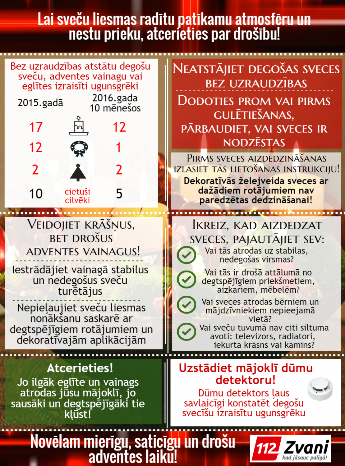 Pagājušajā gadā Adventes laikā ugunsdzēsēji glābēji dzēsa 31 ugunsgrēku, kuri izcēlās degošas svecītes adventes vainagā vai Ziemassvētku eglītē dēļ, vai arī ugunsgrēks izcēlies no bez uzraudzības atstātām degošām svecēm. Dzīvojamās telpās nodzēsts 21 ugunsgrēks, tirdzniecības telpās trīs un biroja telpās –  četri. 2015.gadā šādos ugunsgrēkos cieta 10 cilvēki, bet divi tika izglābti.